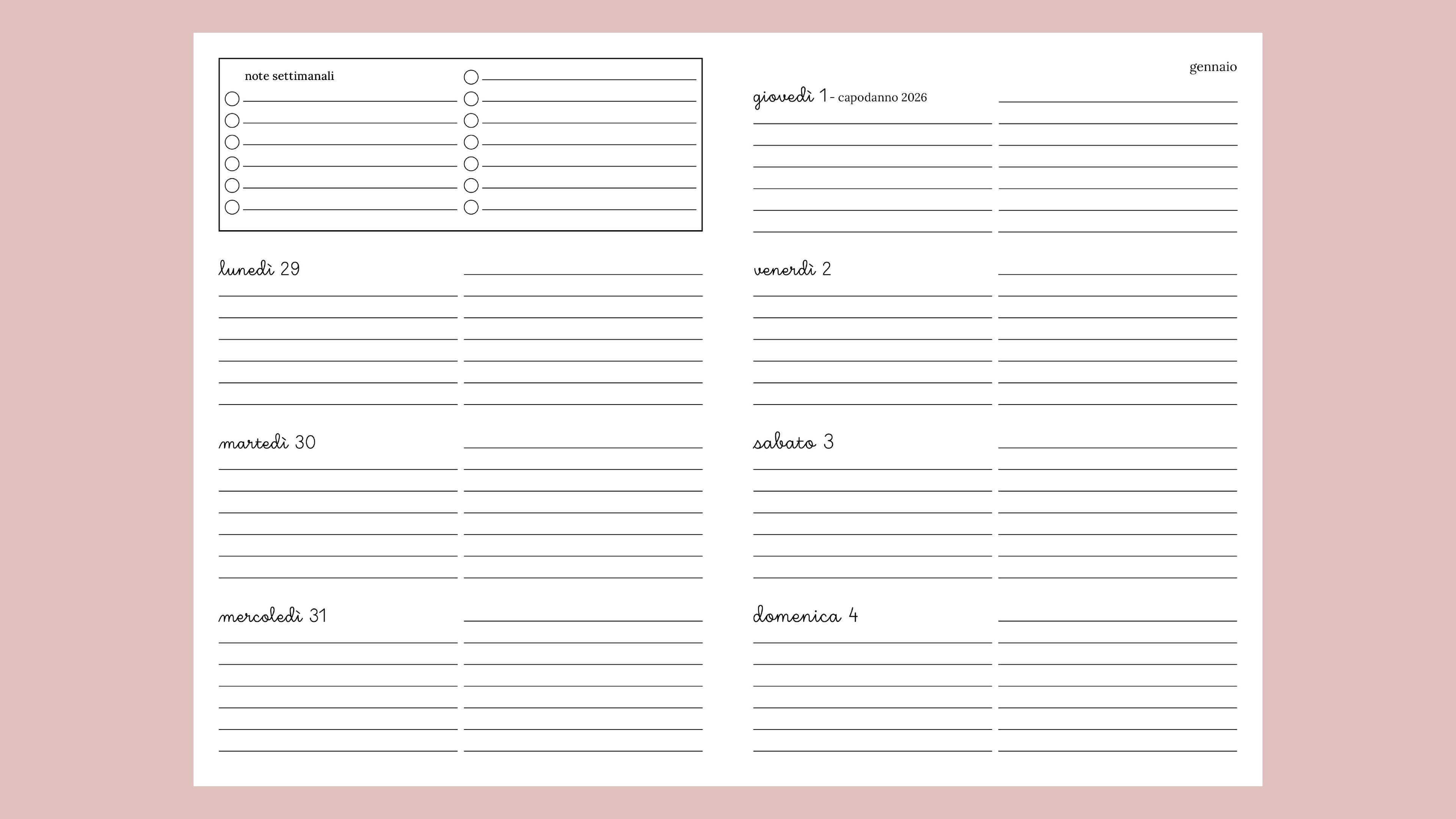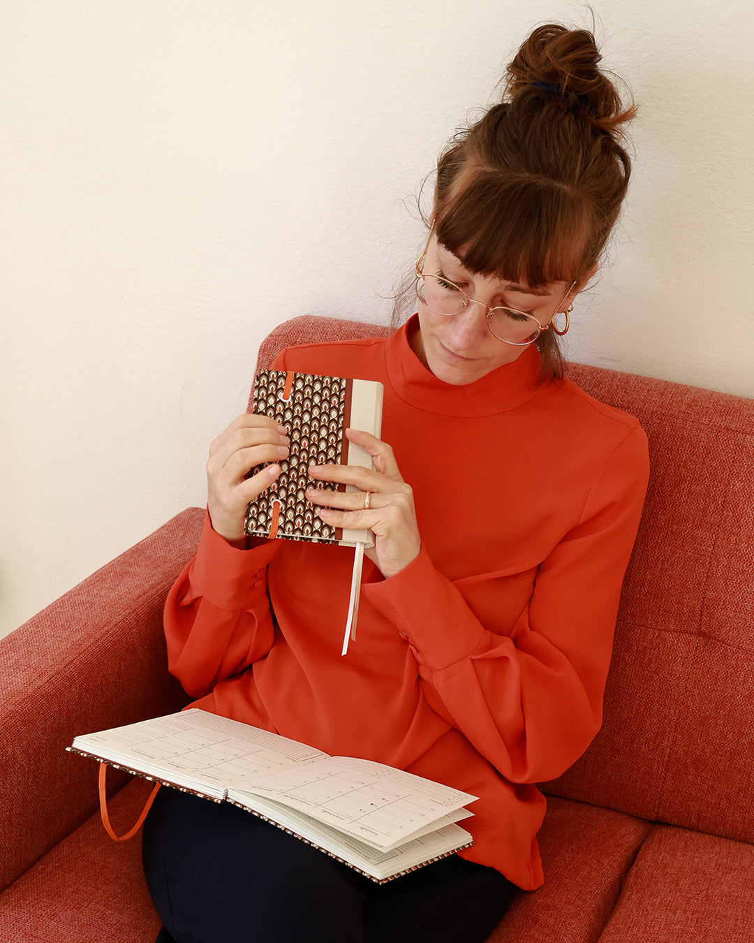 Perfetta per chi desidera trovare conforto nella scrittura a mano, l'agenda personale è uno spazio da abitare con calma — non solo da consultare al volo. Sceglierla significa concedersi una coccola quotidiana: aprirla accarezzando i suoi dettagli artigianali con le dita, ascoltare il fruscio delle pagine spesse, osservare la carta pregiata arricchita dalla bellezza delle proprie tracce lasciate e sentire l’entusiasmo per quelle che si stanno per scrivere.
