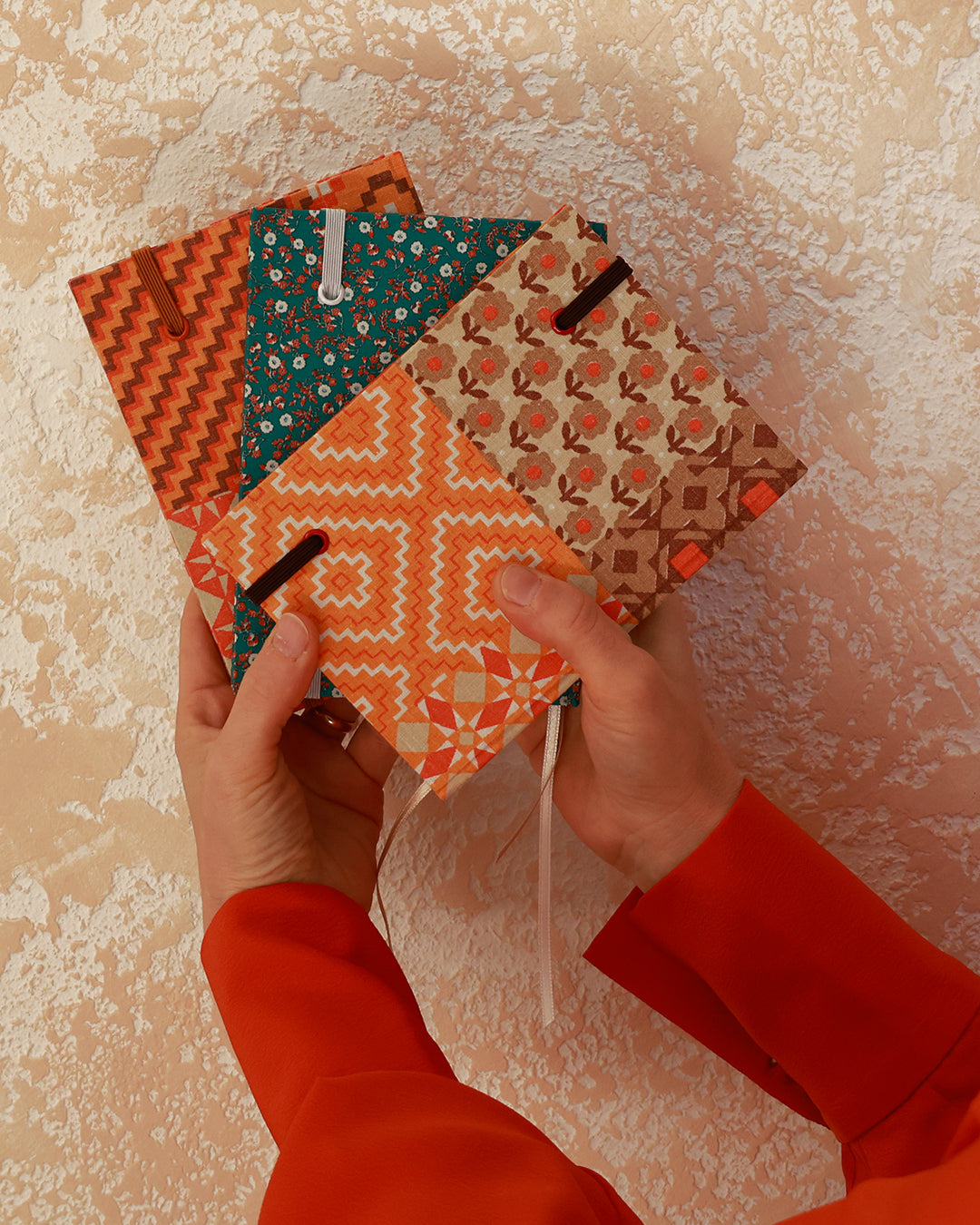 Quaderno A6 dorso quadrato (retto) stile bodoniano kraft avana rosso-marrone figure geometriche