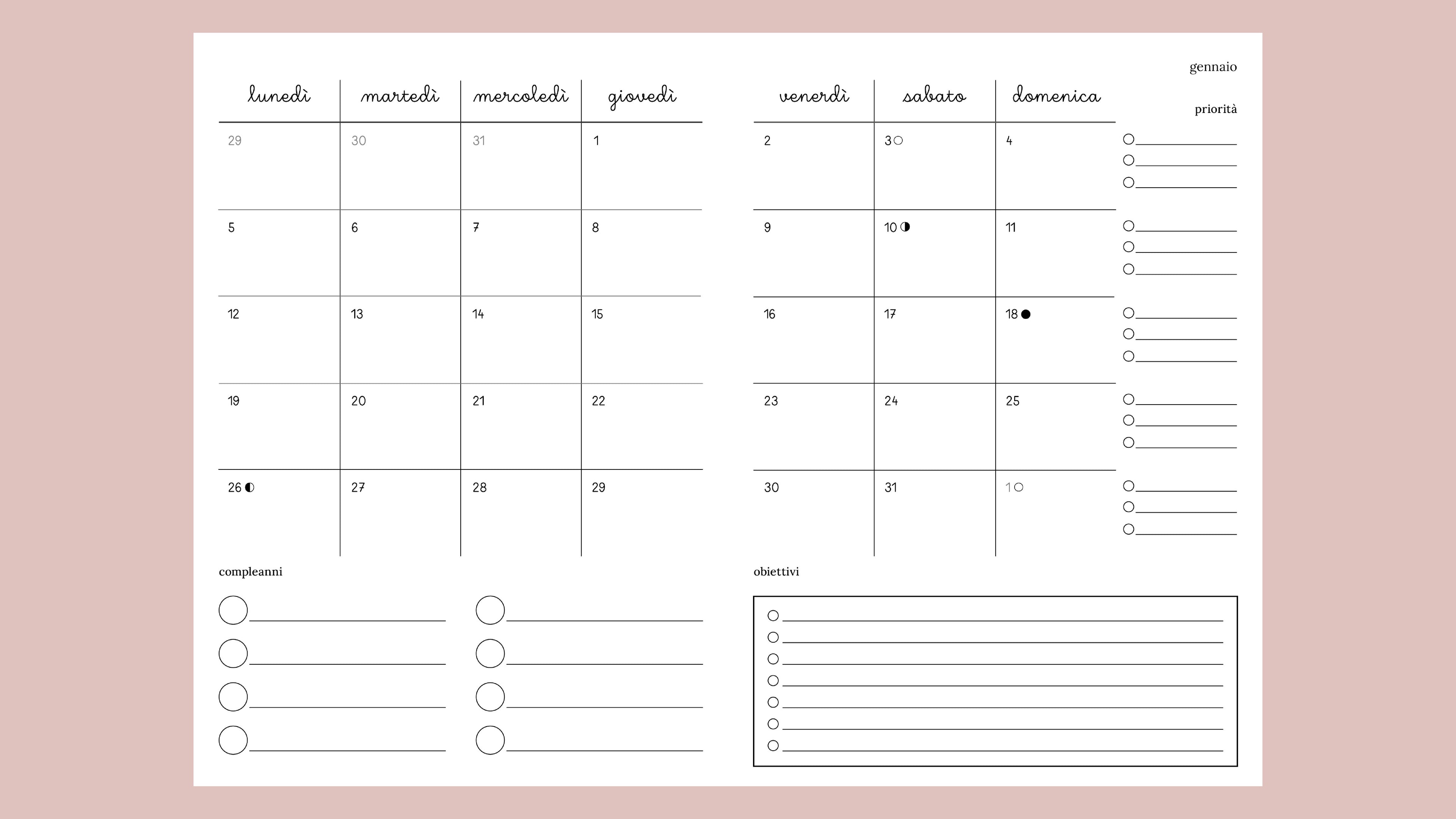 Ogni mese, una tabella per pianificare considerando fasi lunari, obiettivi, compleanni e 3 priorità a settimana