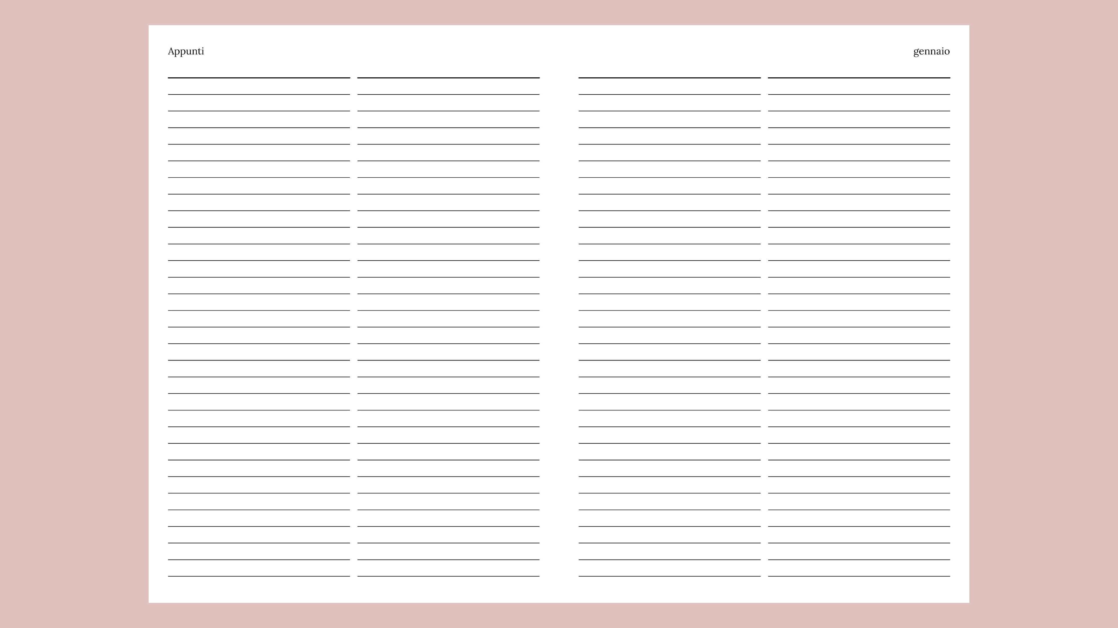 una doppia pagina rigata al mese, con 4 colonne da usare a piacere: una per settimana, o per note a tema