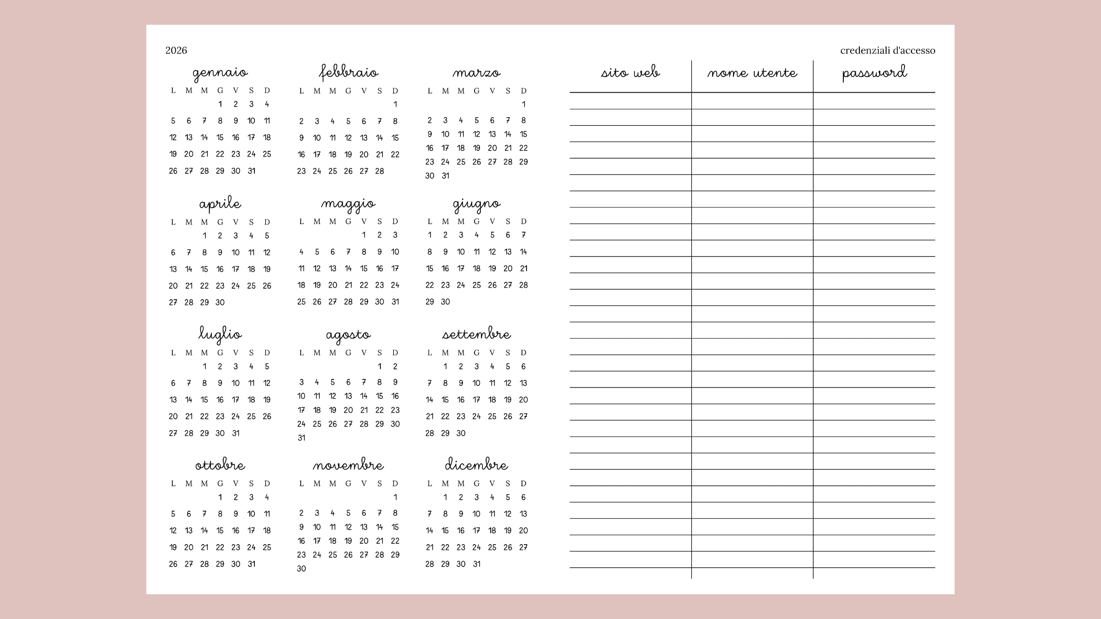 una mappa compatta per segnare ferie, scadenze, turni, allenamenti o una visione colorata dell’umore; accanto, una tabella pratica per raccogliere le credenziali d’accesso a profili e piattaforme.