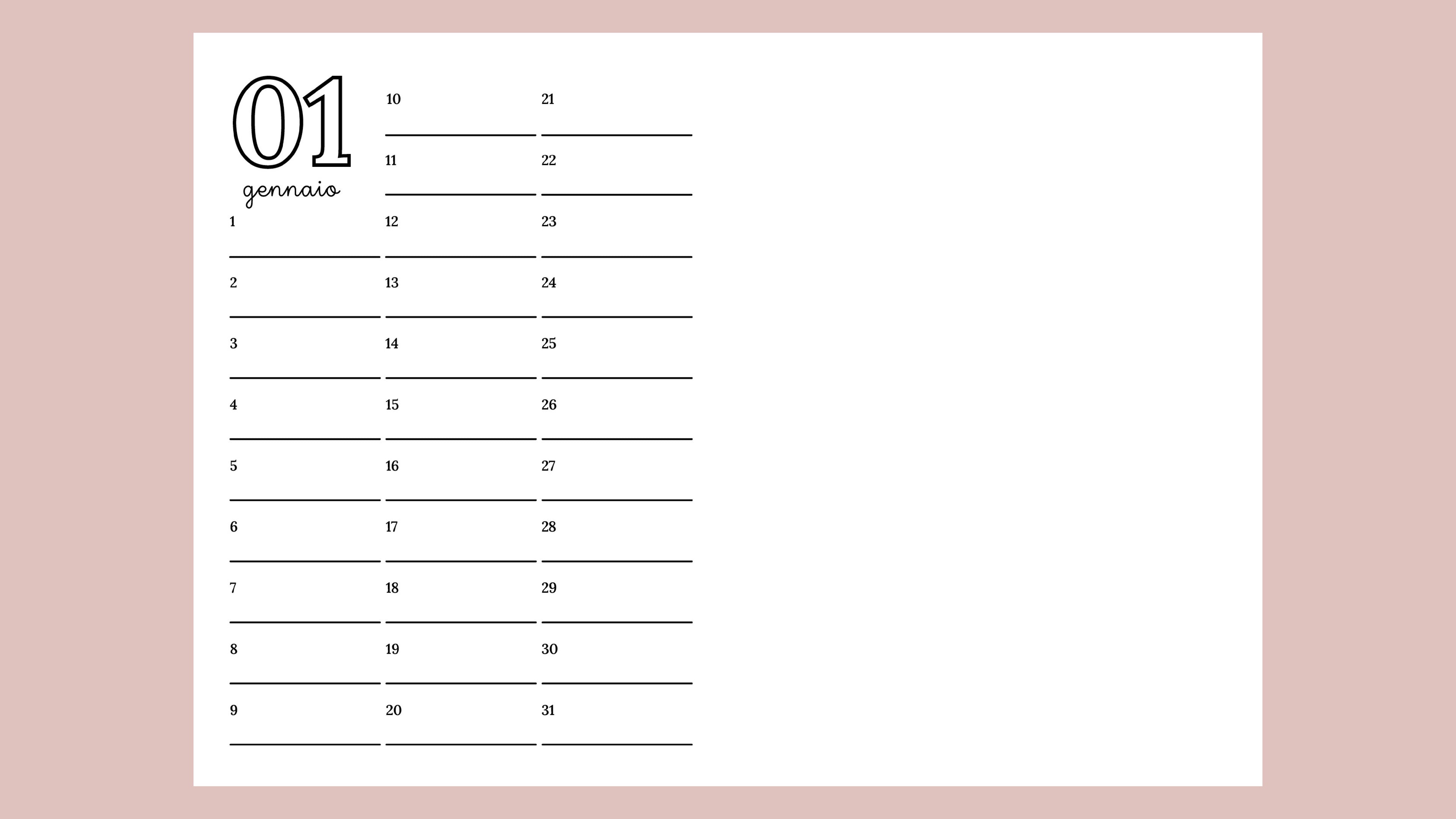 L’anno lo decidi tu e, se vuoi, puoi aggiungere i giorni della settimana in lettere accanto al numero corrispondente, trasformando ogni pagina in uno spazio su misura per i tuoi impegni, pensieri e progetti quotidiani.