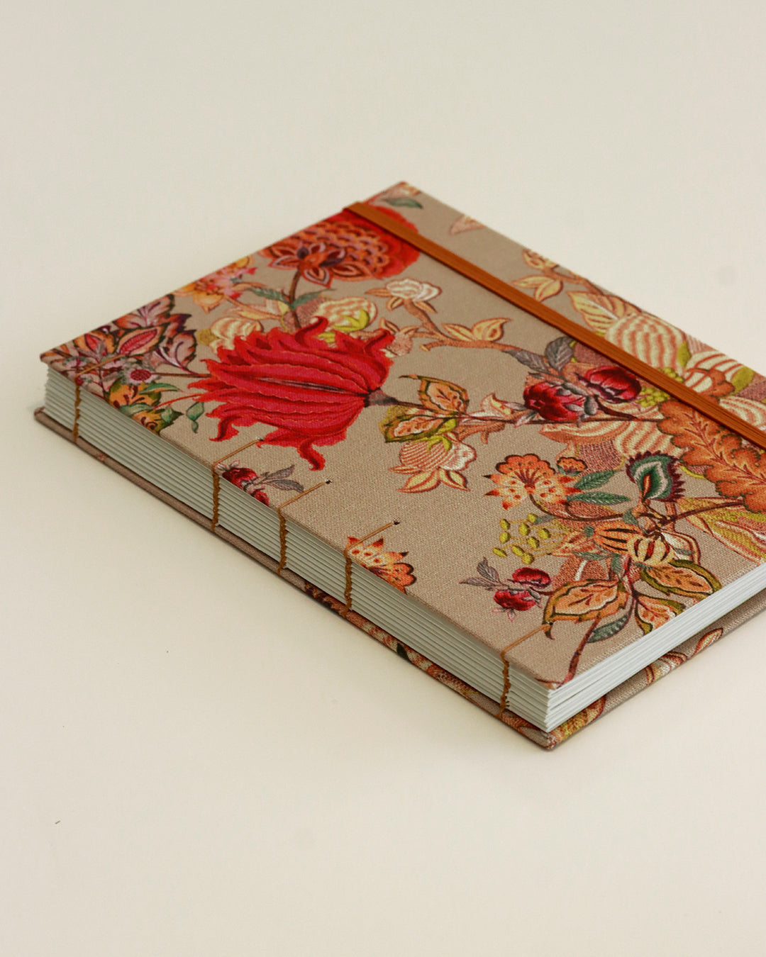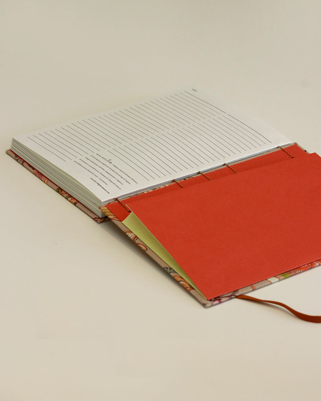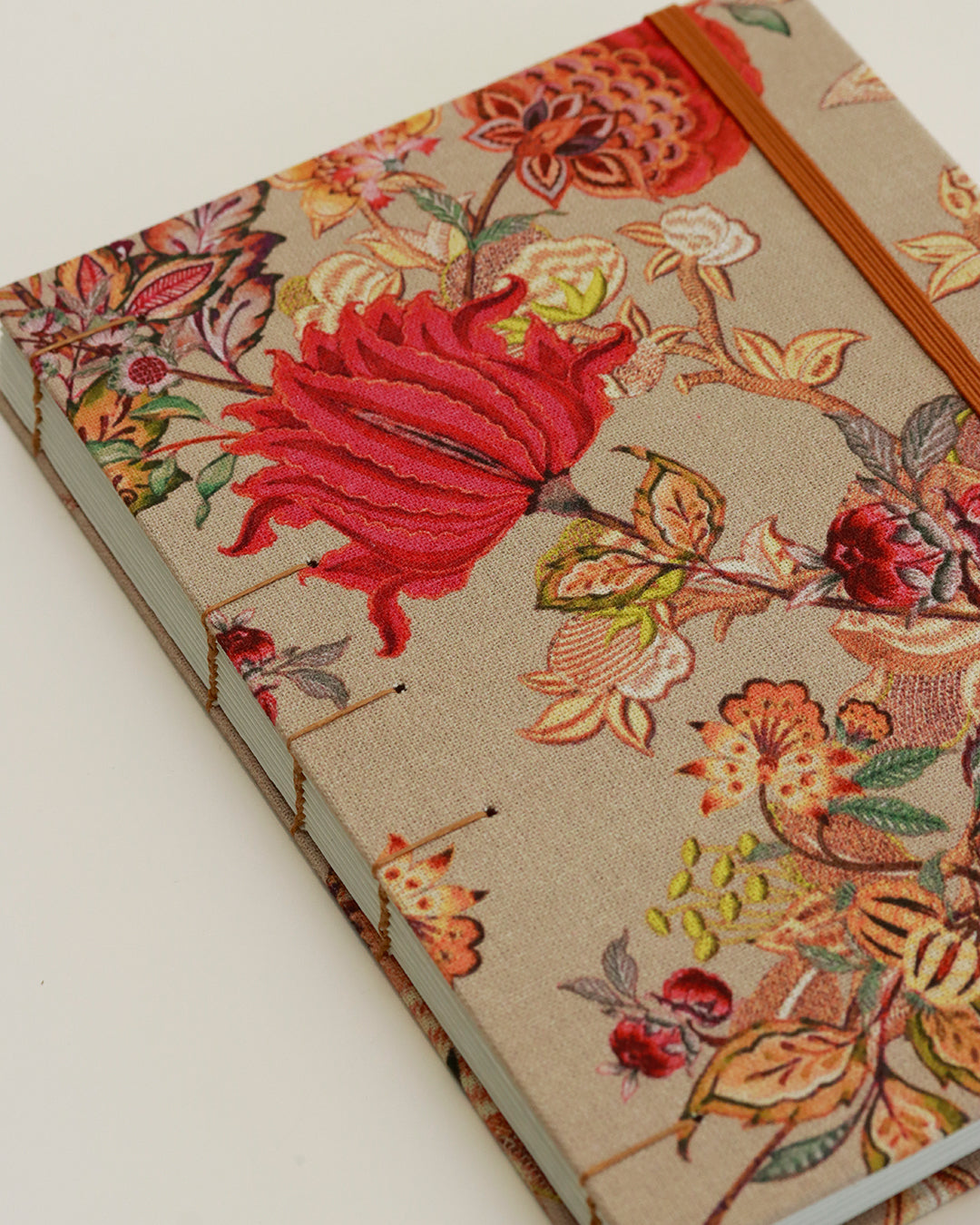 Il filo di cucitura, l'elastico e gli occhielli riprendono i toni castani dorati (golden brown) dello sfondo della fantasia, mentre all'interno la terra rossa delle pagine di guardia e della busta - coi suoi bordi giallo pallido - richiamano i fiori sontuosi.