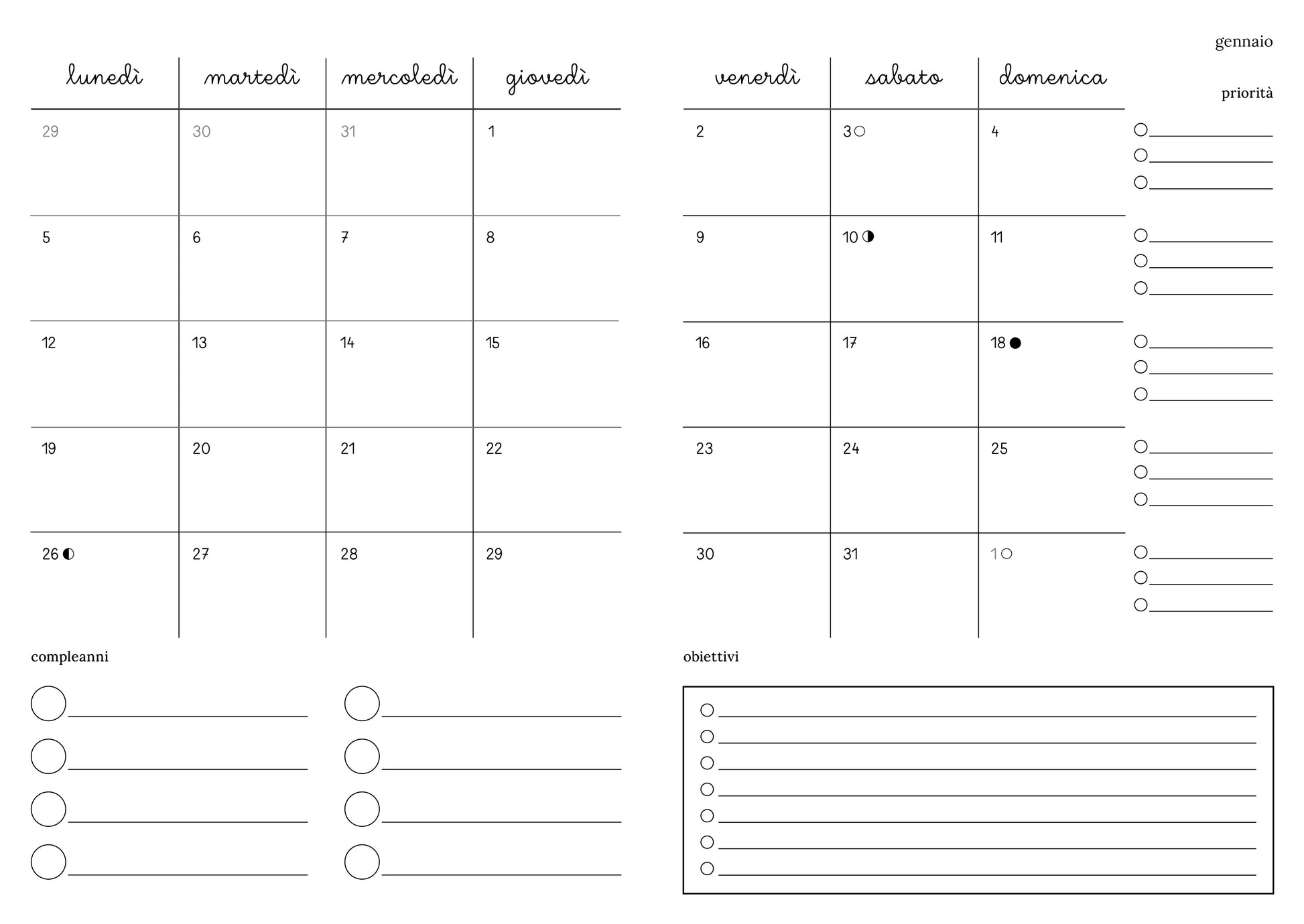 Agenda datata per 12 mesi dal 1 gennaio 2025 al 31 dicembre 2026 con indicati i giorni festivi in Italia e Svizzera e le fasi lunari.