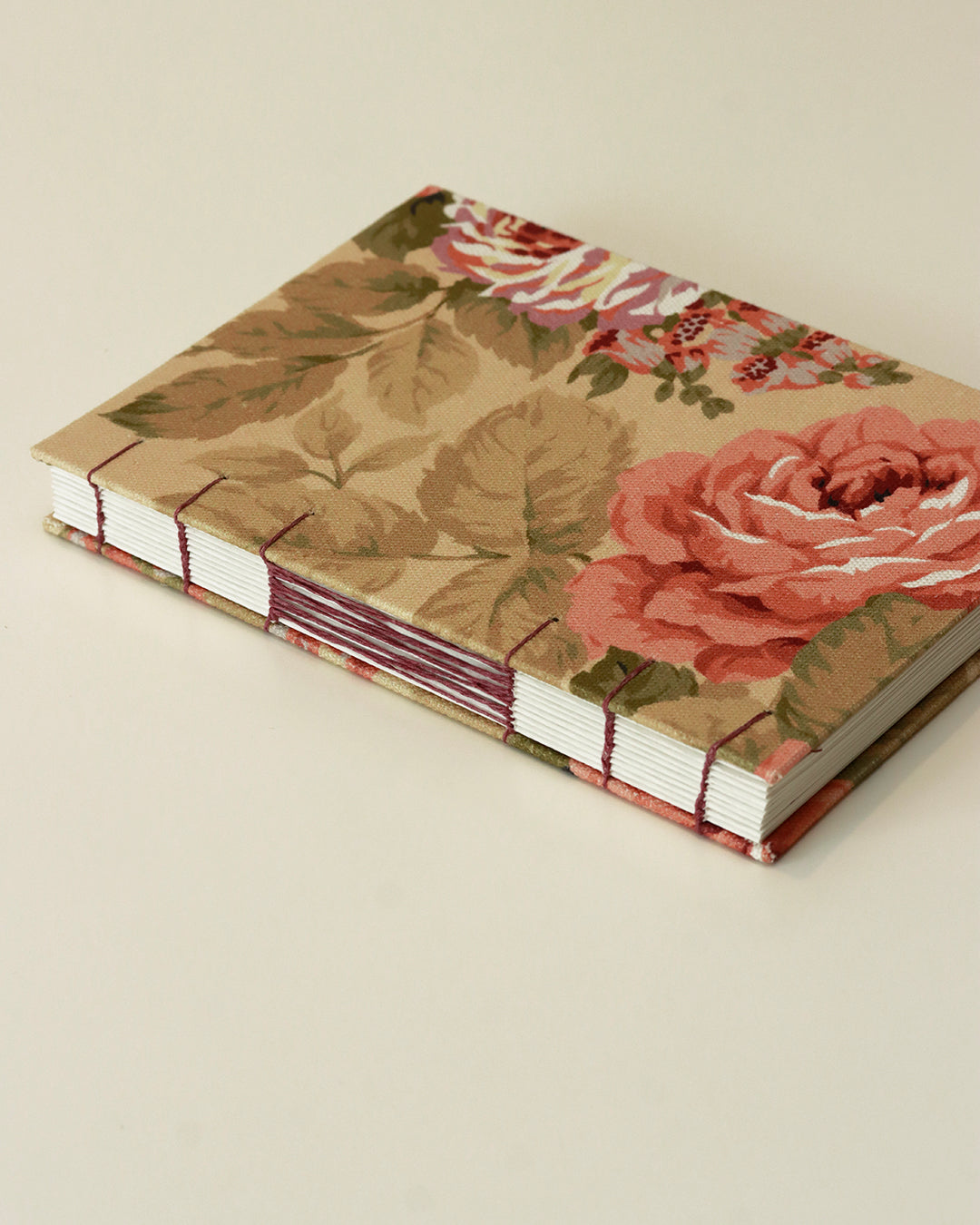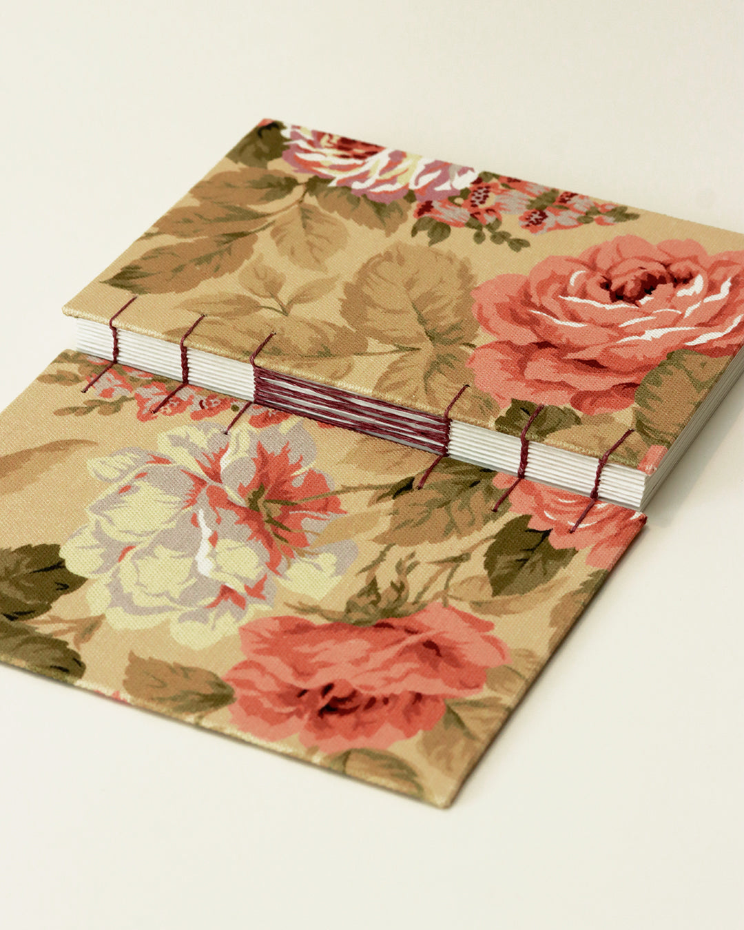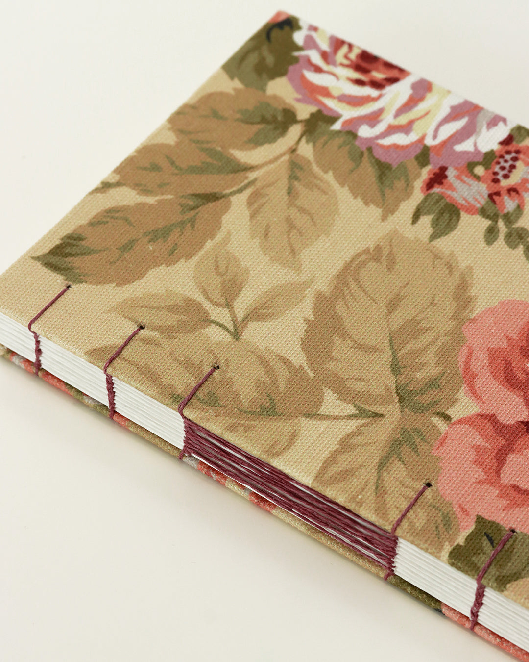 Ritaglio di tappezzeria canvas con foglie verdi e romantiche rose dalle sfumature bordeaux, salmone e rosa antico scuro - il colore del filo di lino usato per la cucitura.
