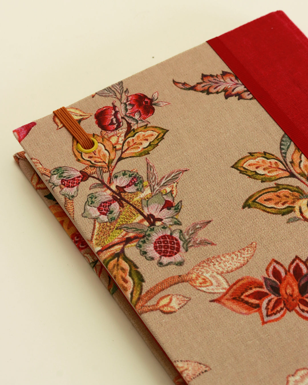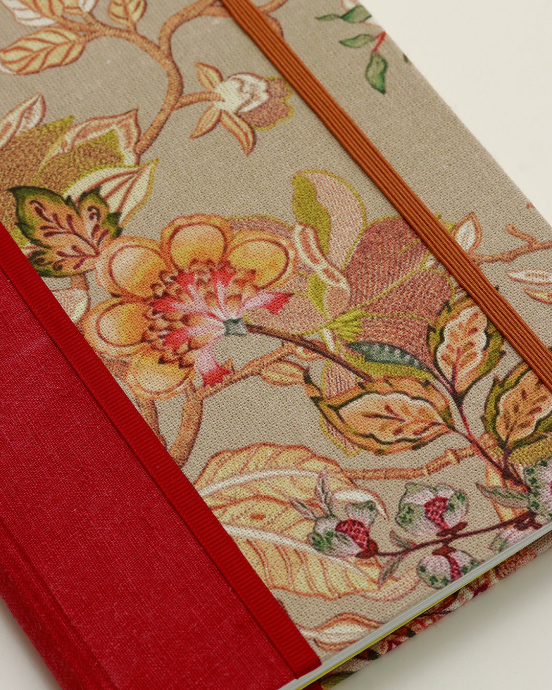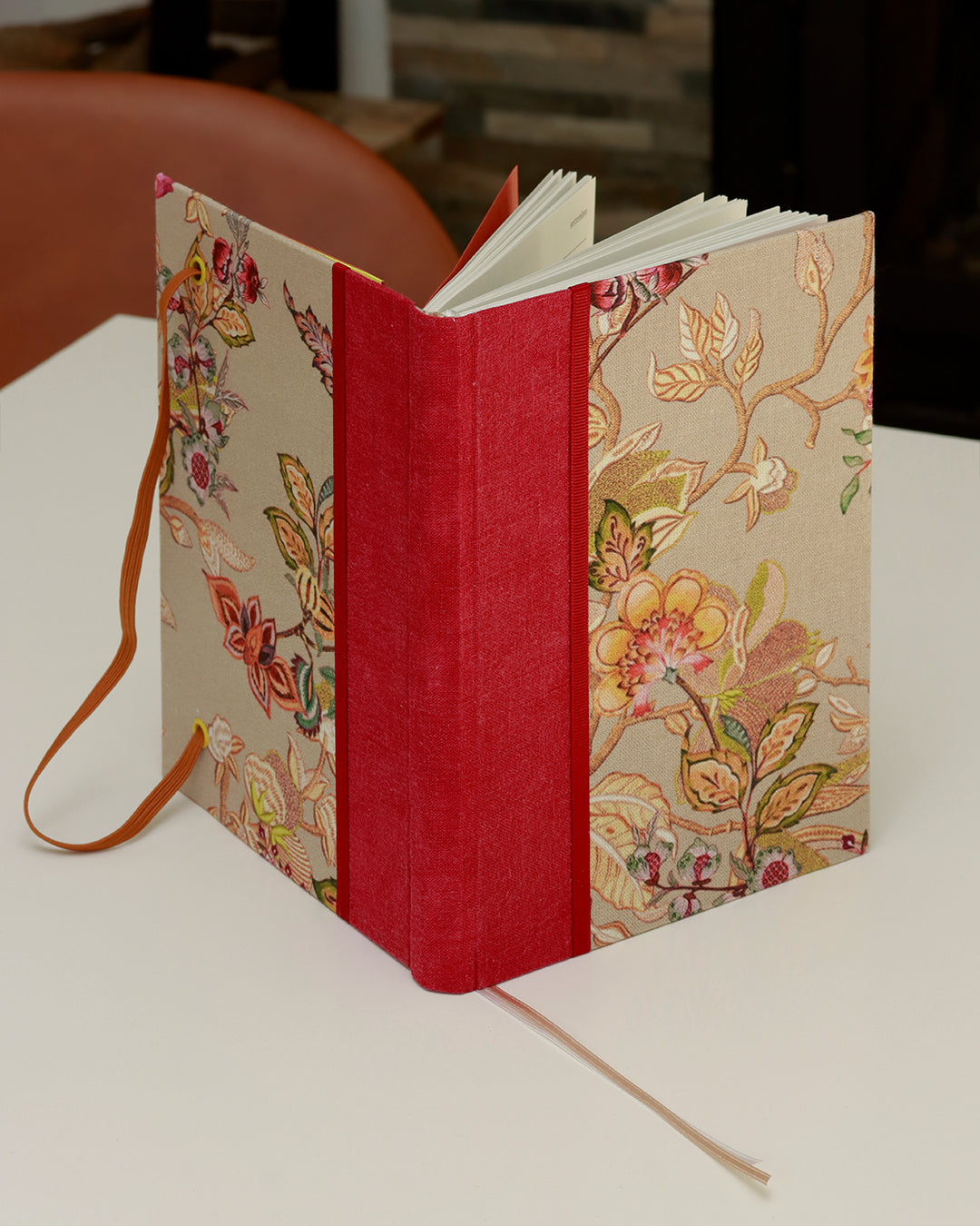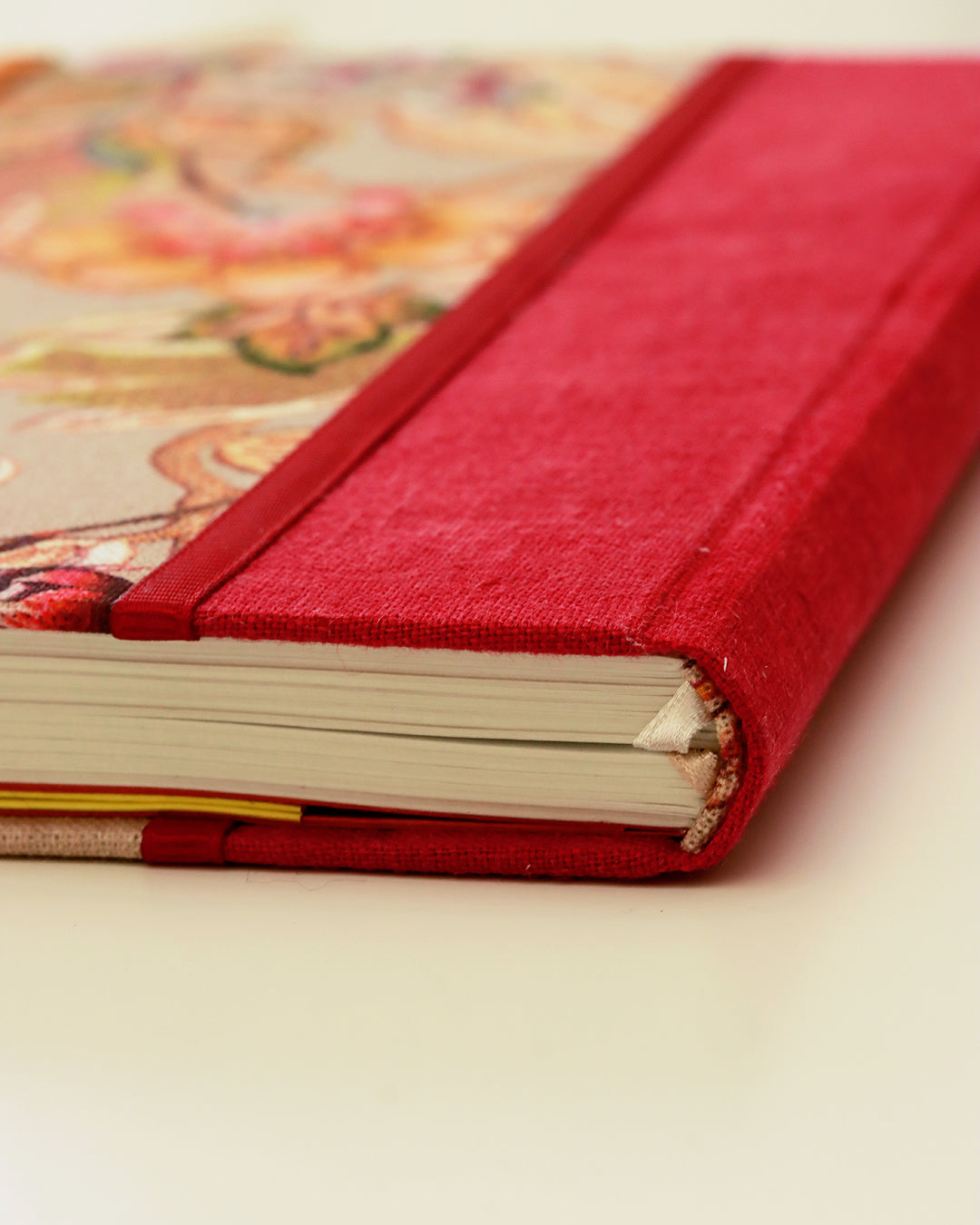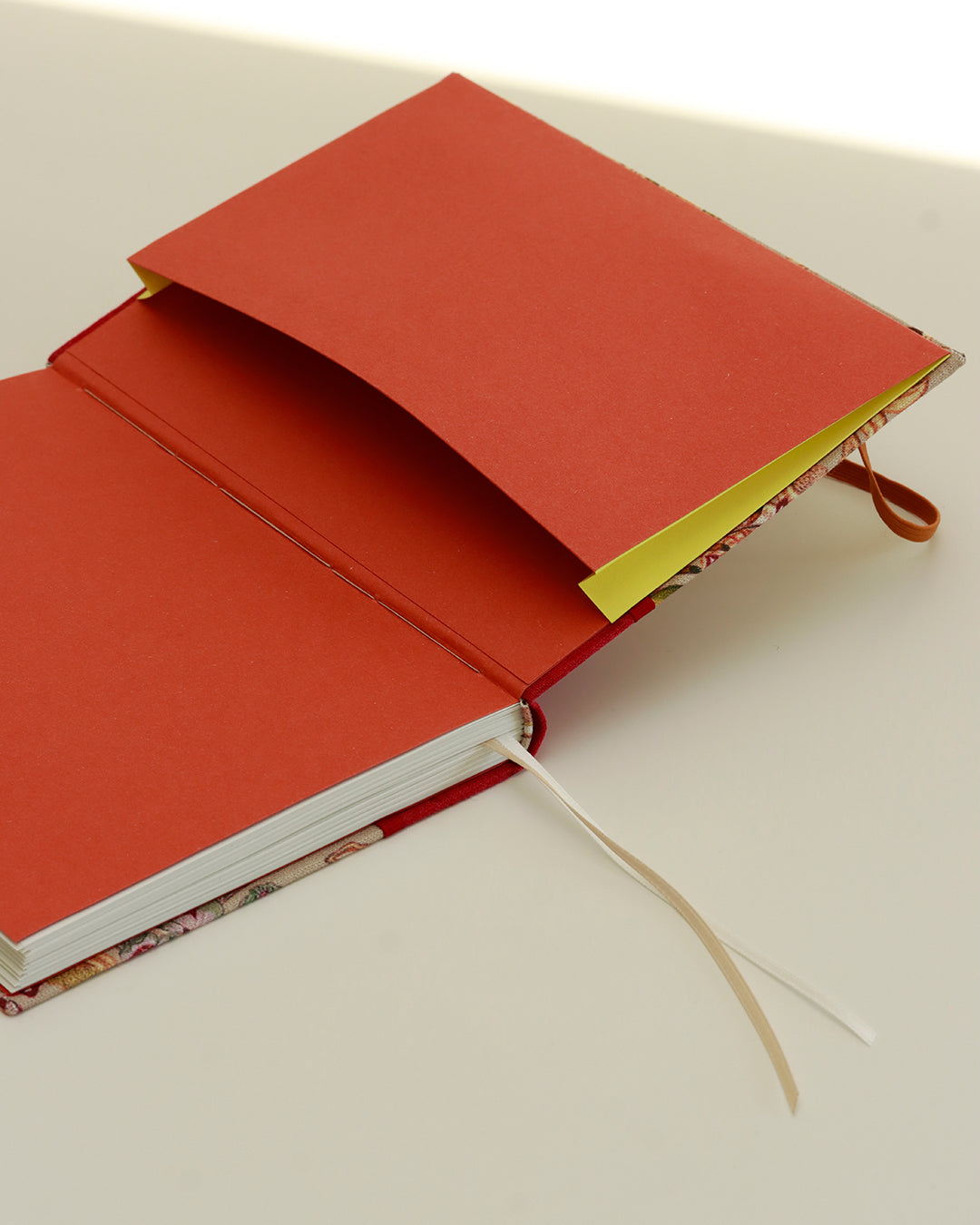 Dorso arrotondato rivestito in lino di recupero rosso. I nastrini in gros grain sono bordeaux, l'elastico di chiusura marrone e gli occhielli gialli come i bordini della busta capiente in cartoncino terra rossa.