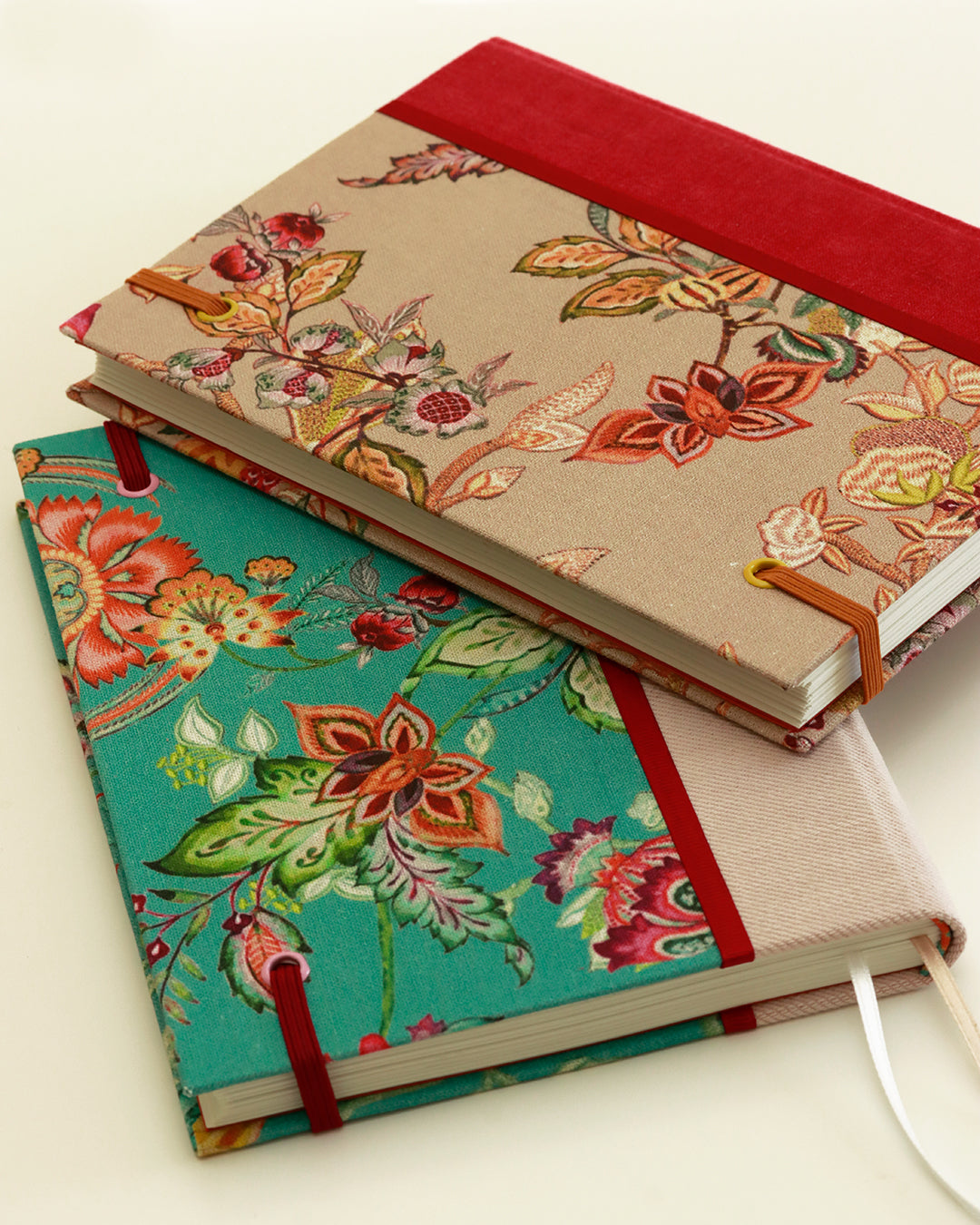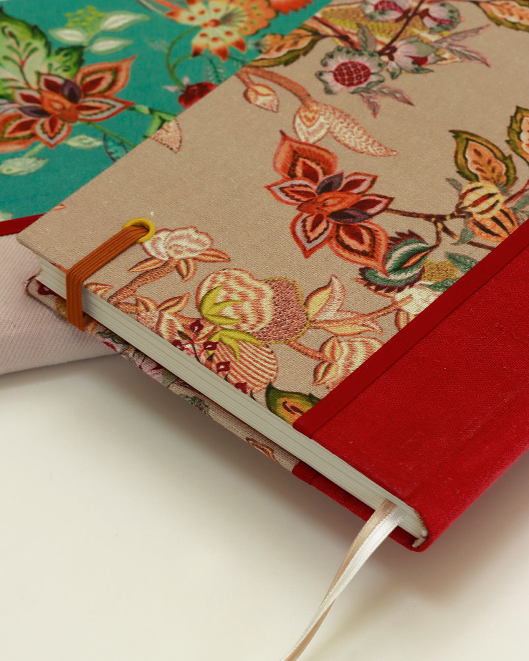 La rilegatura con dorso arrotondato ha uno stile moderno e lineare, quasi editoriale - evoca le prestigiose legature dei libri stampati, con un'estetica sobria e compatta. La sua bellezza non è appariscente, ma si rivela nei dettagli fini. La doppia linea ad arco del dorso e del capitello, il tessuto in tinta unita al centro, i nastrini colorati in gros-grain che segnano con precisione la divisione tra piatto anteriore, dorso e piatto posteriore, creando una composizione simmetrica (fantasia – tinta unita – fantasia): sono tutti elementi che parlano a chi ama l’ordine, l’equilibrio delle forme e gli oggetti ben fatti, rifiniti e funzionali con dettagli solidi e rassicuranti.