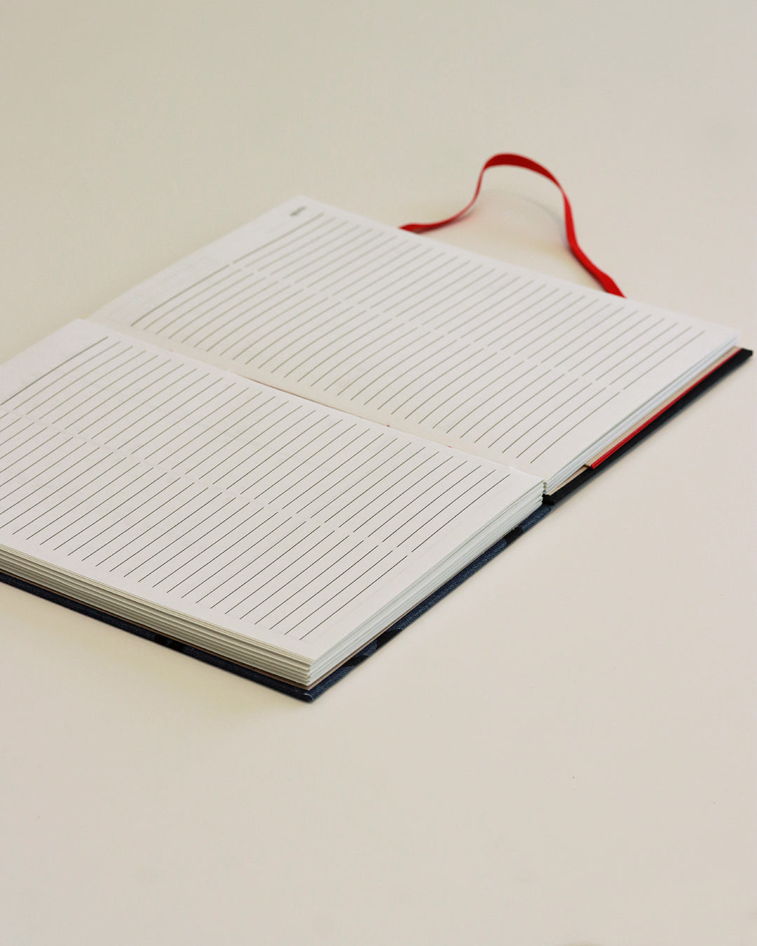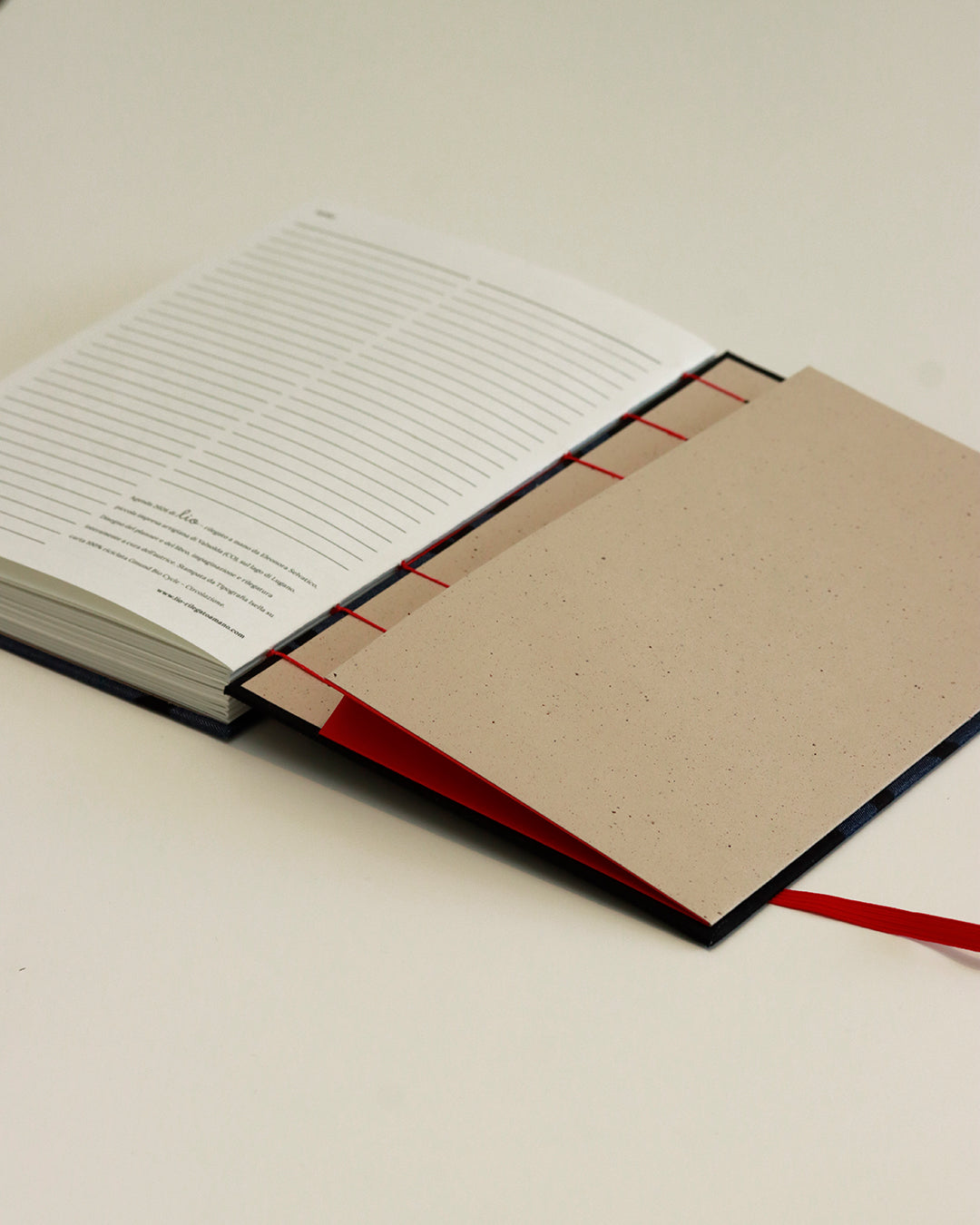 La rilegatura a mano consente l'accesso all'intera pagina e un'ottima apertura a (oltre) 180 gradi. Questo rende l'agenda molto comoda per scrivere sia appoggiate su un tavolo sia - perché no - sulle gambe: sì!, anche questo è un vantaggio della copertina rigida.
