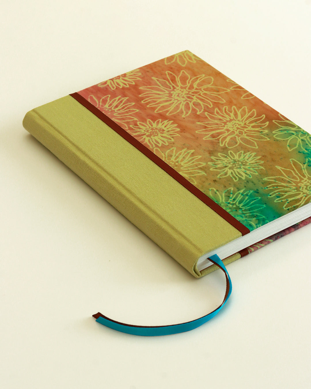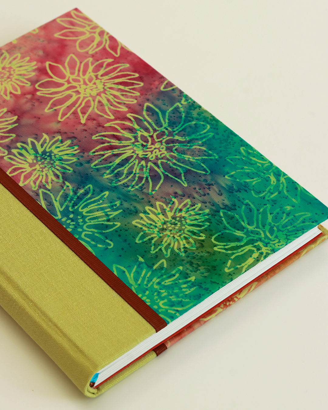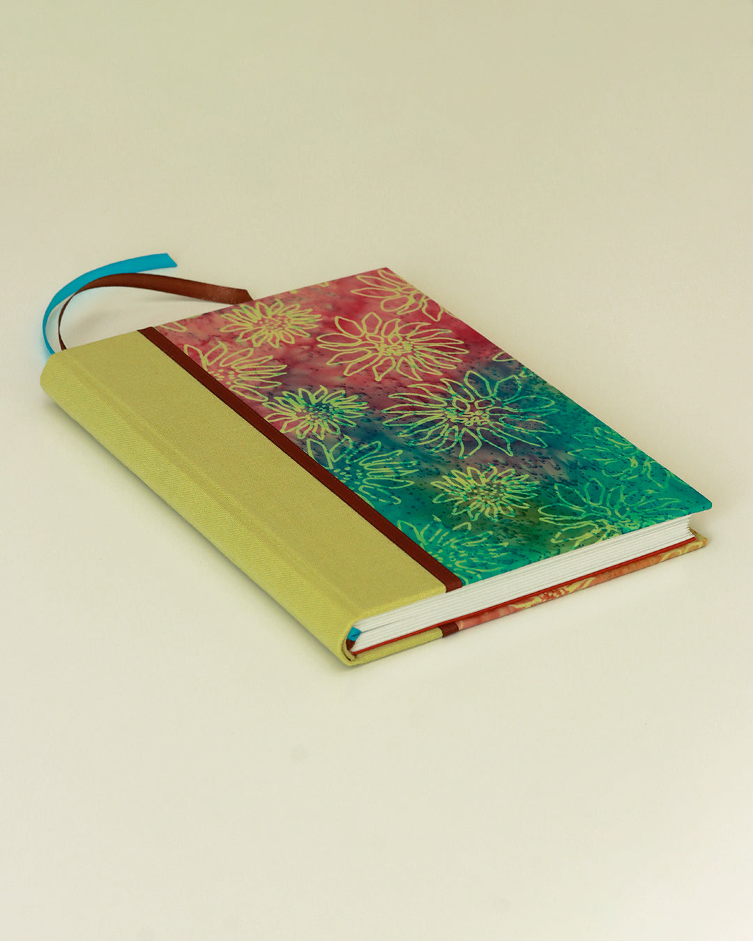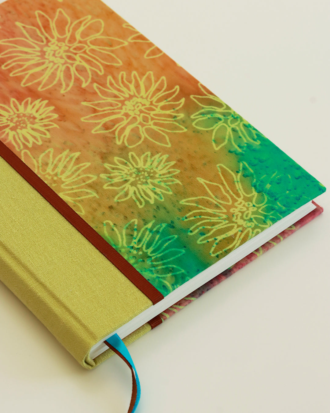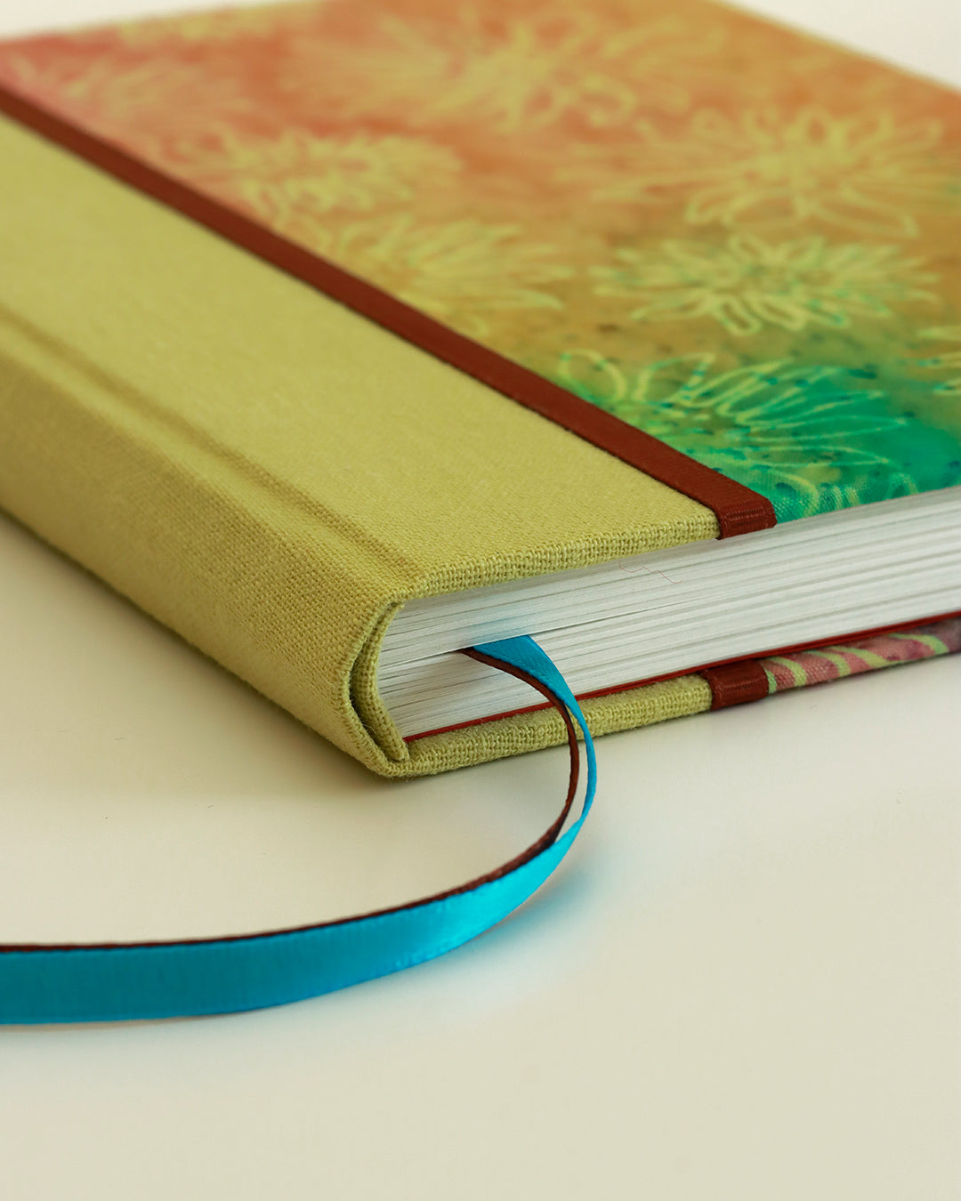 La rilegatura con dorso arrotondato ha uno stile moderno e lineare, quasi editoriale - evoca le prestigiose legature dei libri stampati, con un'estetica sobria e compatta. La sua bellezza non è appariscente, ma si rivela nei dettagli fini. La doppia linea ad arco del dorso e del capitello, il tessuto in tinta unita al centro, i nastrini colorati in gros-grain che segnano con precisione la divisione tra piatto anteriore, dorso e piatto posteriore, creando una composizione simmetrica (fantasia – tinta unita – fantasia): sono tutti elementi che parlano a chi ama l’ordine, l’equilibrio delle forme e gli oggetti ben fatti, rifiniti e funzionali con dettagli solidi e rassicuranti.