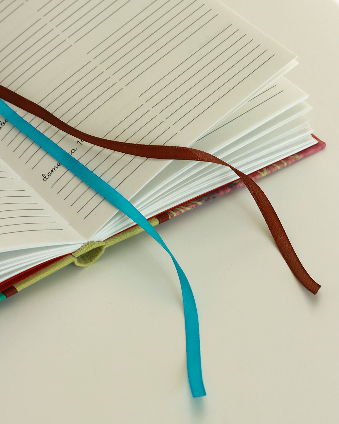 La rilegatura a mano consente l'accesso all'intera pagina e un'ottima apertura a (oltre) 180 gradi. Questo rende l'agenda molto comoda per scrivere sia appoggiate su un tavolo sia - perché no - sulle gambe: sì!, anche questo è un vantaggio della copertina rigida.
