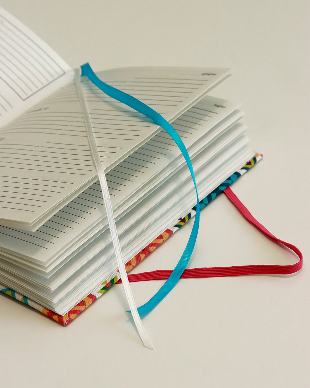 La rilegatura a mano consente l'accesso all'intera pagina e un'ottima apertura a (oltre) 180 gradi. Questo rende l'agenda molto comoda per scrivere sia appoggiate su un tavolo sia - perché no - sulle gambe: sì!, anche questo è un vantaggio della copertina rigida.