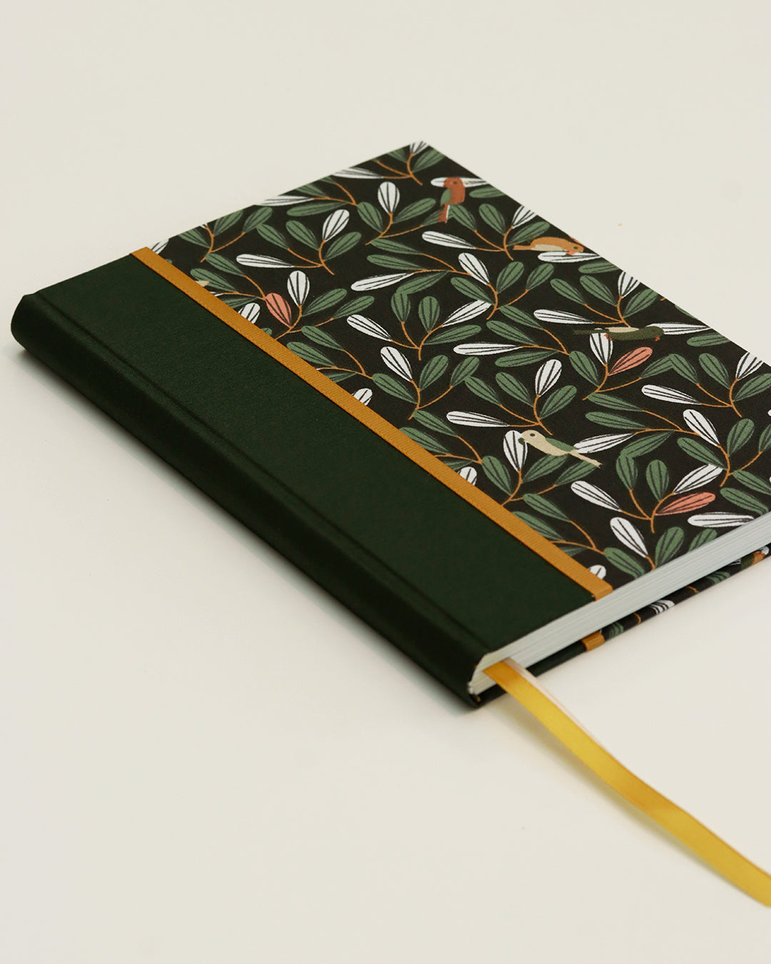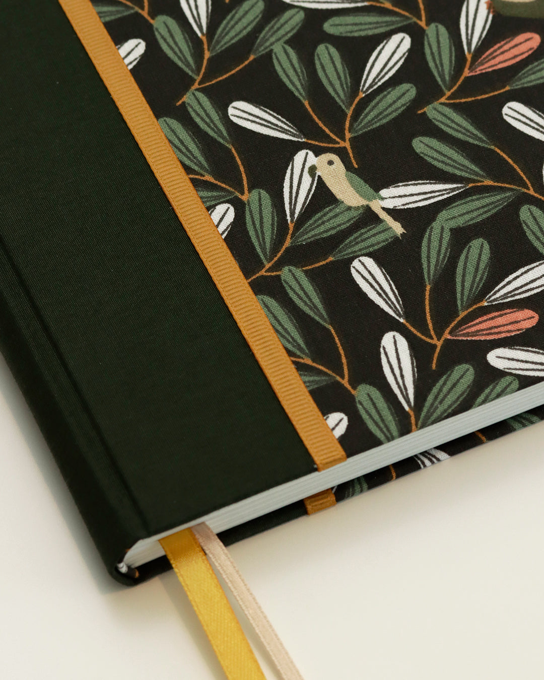 Il dorso è rivestito con un tessuto di recupero verde scuro, mentre i nastrini in gros grain sono castani dorati.