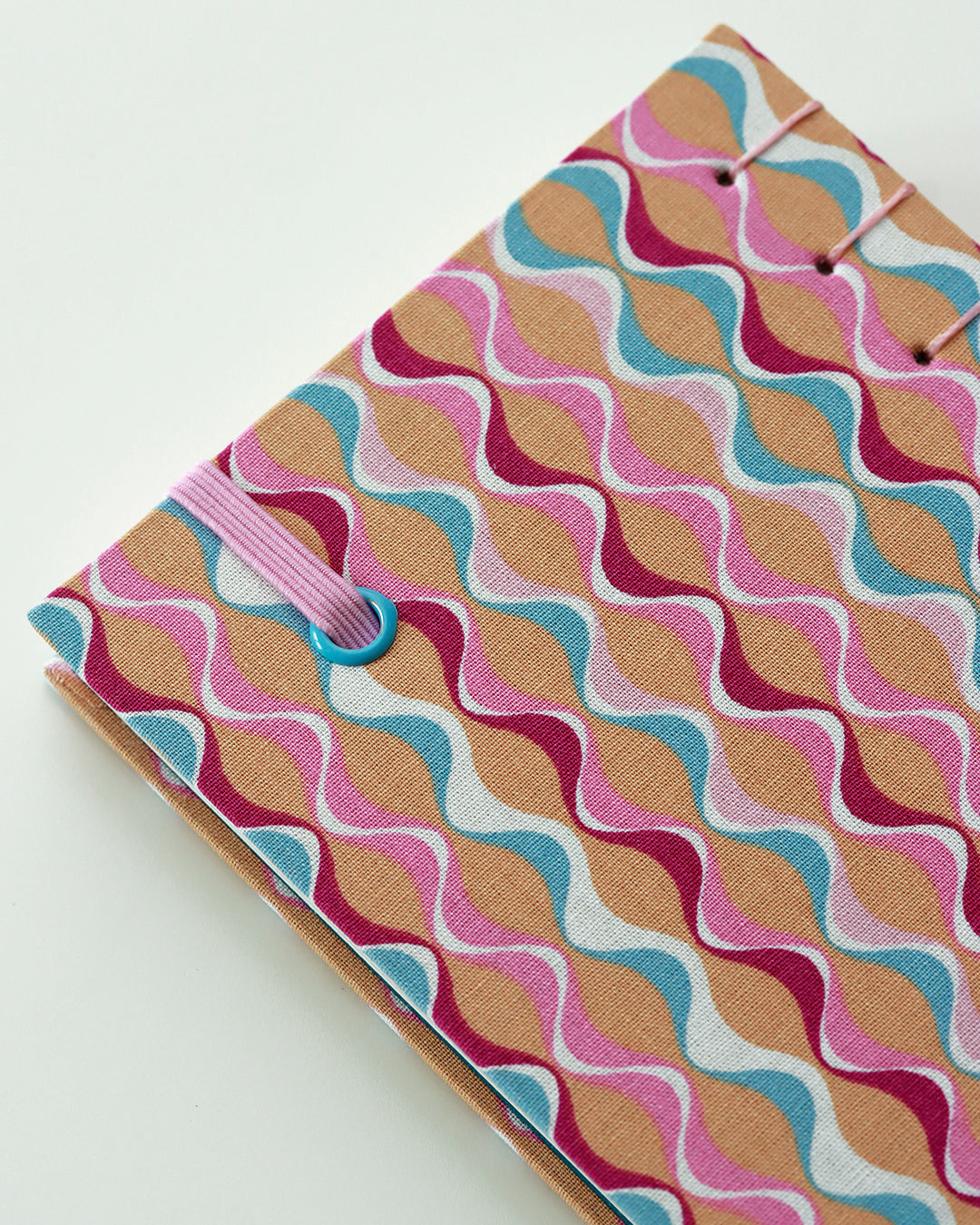 Elastico di chiusura rosa come il filo di cucitura, gli occhielli sono azzurri, mentre le pagine di guardia sono blu petrolio.