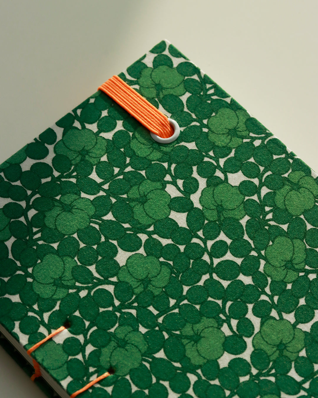 Elastico di chiusura, filo di cucitura e bordini della busta sono arancioni, mentre gli occhielli bianchi e i cartoncini che rivestono l'interno delle copertine sono verdigris.