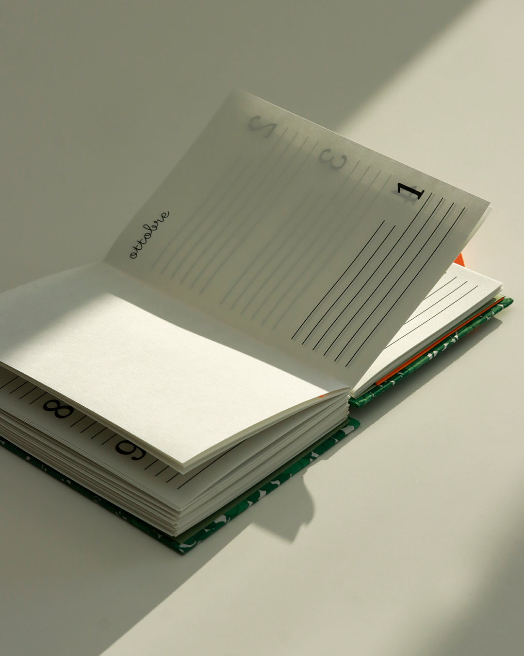 Le 160 pagine dell’agenda sono stampate dalla tipografia Isella (CO) su una carta ecologica bianca di alta qualità, che si distingue per la sua particolare matericità. In mano i fogli appaiono rigidi, insoliti per una grammatura da 100 g/m²; al tatto la superficie sorprende per la sua levigatezza (liscia), mentre alla vista si presenta con una raffinata pergamenatura ad effetto nuvola.