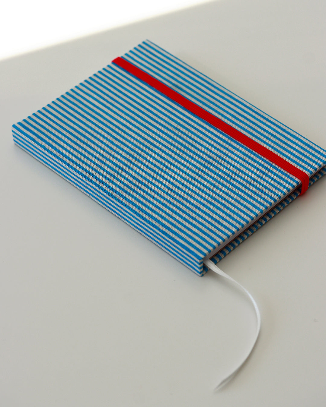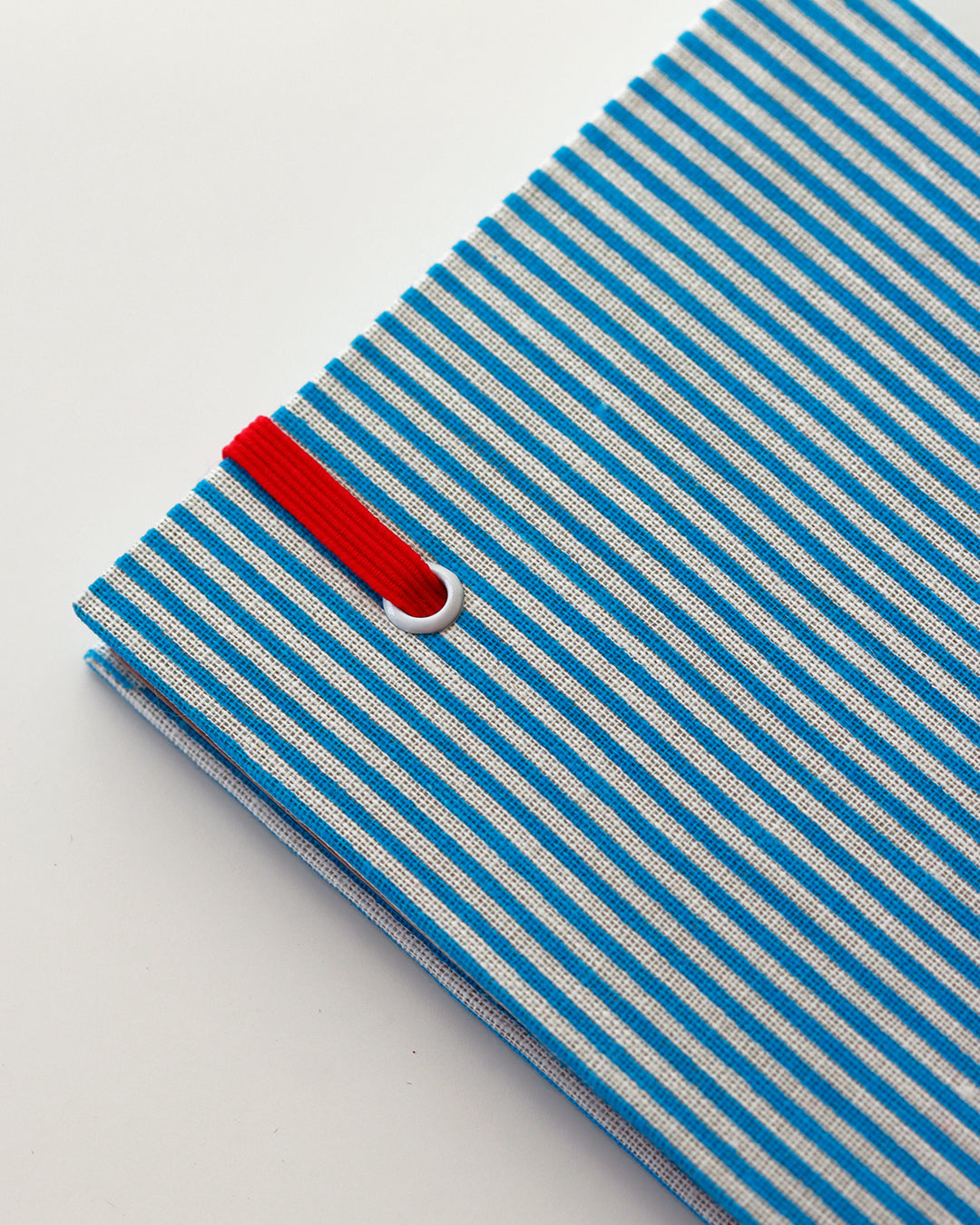 Tessuto di riuso rigato bianco e blu. L'elastico è fucsia, mentre gli occhielli, il segnalibro e le pagine di guardia sono bianche.