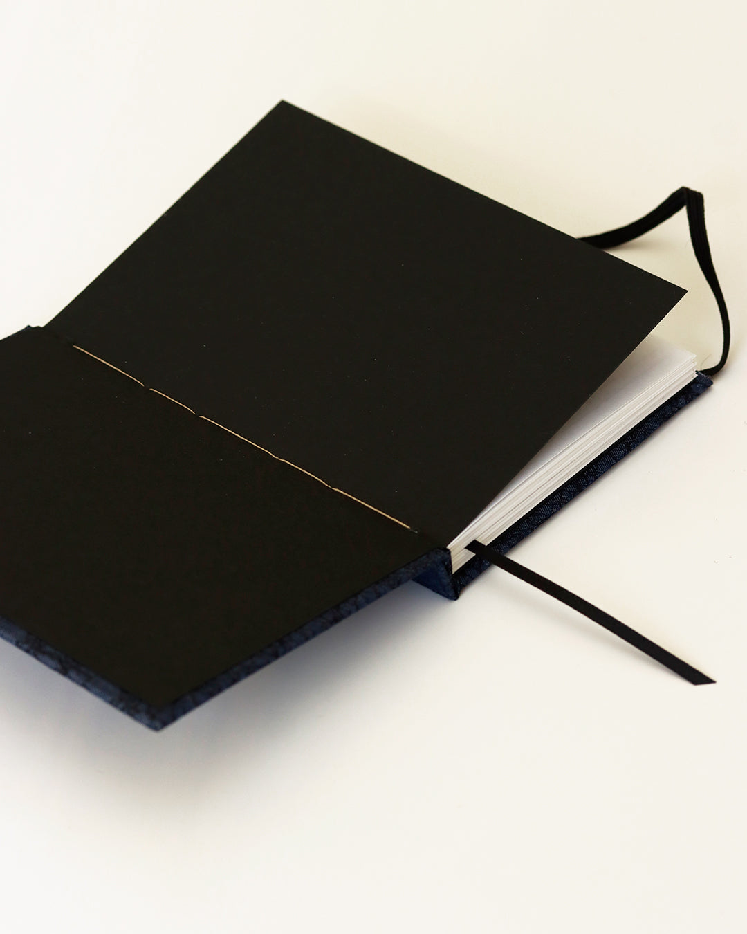 Tessuto di recupero (ritaglio di sartoria) con fantasia floreale nera ricamata su jeans. L'elastico, gli occhielli, il segnalibro e le pagine di guardia sono neri.