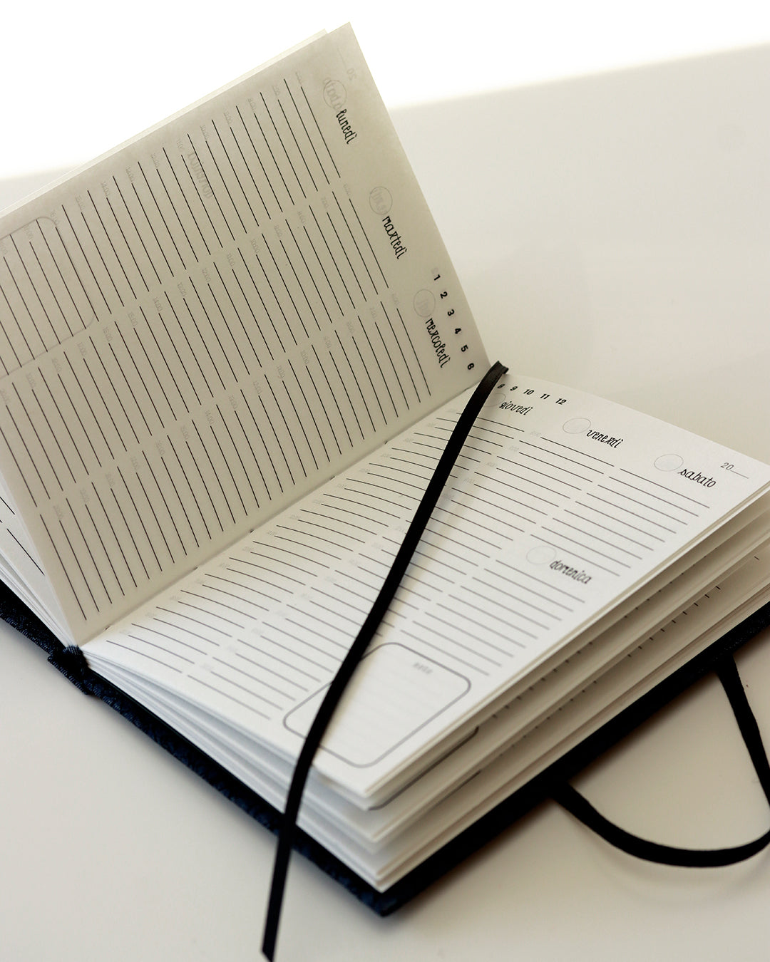 Il disegno interno è essenziale e versatile, perfetto per chi ha il dono della sintesi - o desidera allenarlo. Il layout verticale settimanale con orari aiuta a distribuire le attività senza rigidità, ma con ordine e semplicità. Le righe corte incoraggiano una scrittura breve e schietta, più a parole chiave che a frasi: così i contenuti saltano all'occhio non appena si apre l'agenda e non si disperdono nel testo.