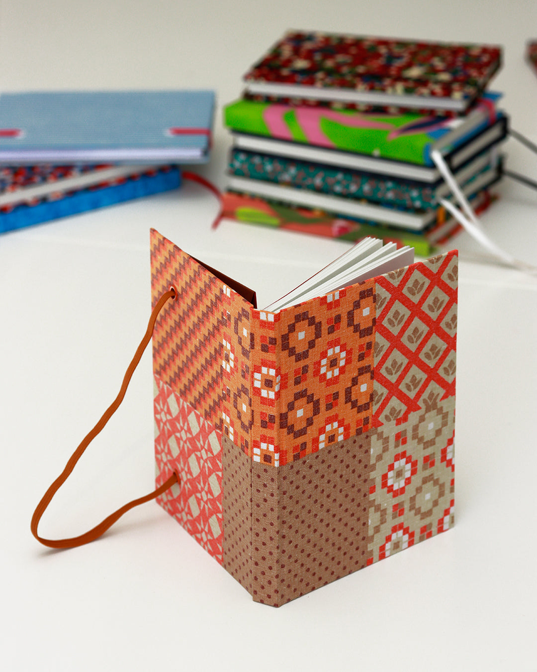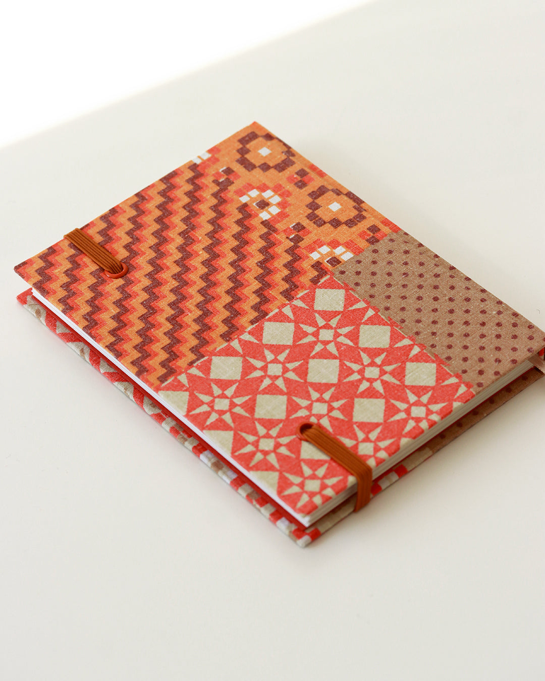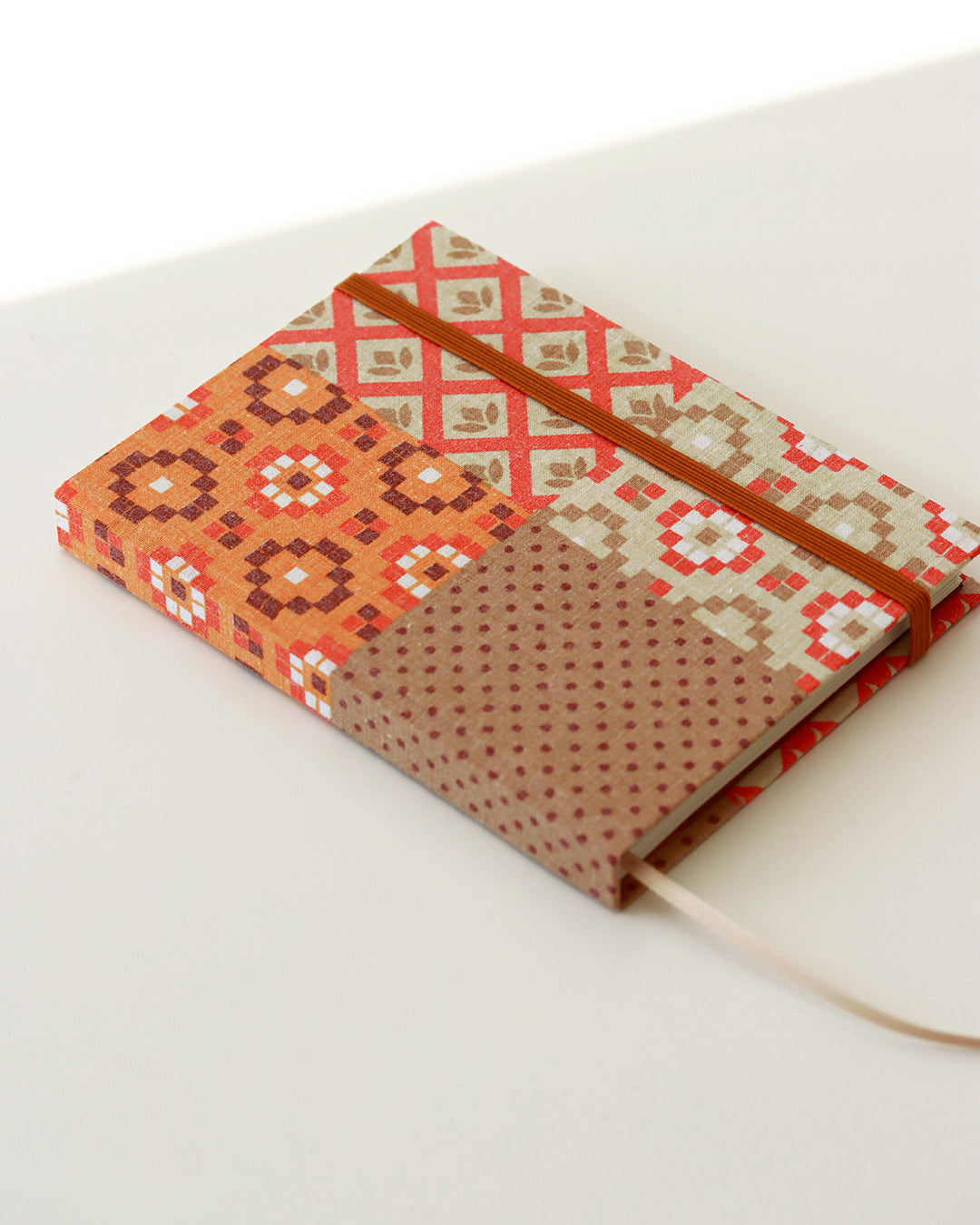 Tessuto in cotone di riuso (era un lenzuolo) con riquadri a fantasie geometriche arancione, marrone, beige e bianco. L'elastico e gli occhielli sono marroni, il segnalibro beige e le pagine di guardia - come la busta coi bordi marroni - sono arancioni.