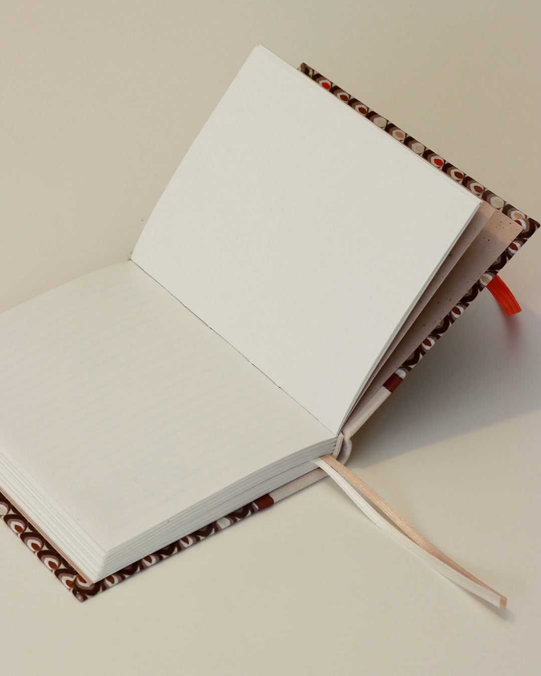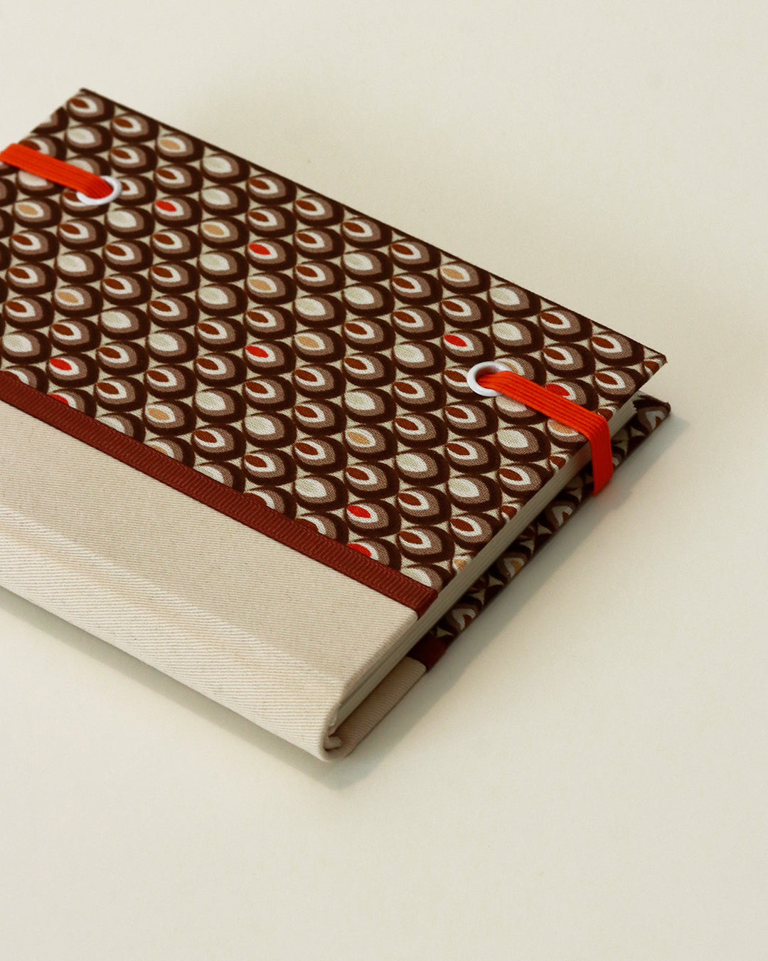 La rilegatura con dorso arrotondato ha uno stile moderno e lineare, quasi editoriale - evoca le prestigiose legature dei libri stampati, con un'estetica sobria e compatta. La sua bellezza non è appariscente, ma si rivela nei dettagli fini. La doppia linea ad arco del dorso e del capitello, il tessuto in tinta unita al centro, i nastrini colorati in gros-grain che segnano con precisione la divisione tra piatto anteriore, dorso e piatto posteriore, creando una composizione simmetrica (fantasia – tinta unita – fantasia): sono tutti elementi che parlano a chi ama l’ordine, l’equilibrio delle forme e gli oggetti ben fatti, rifiniti e funzionali con dettagli solidi e rassicuranti.