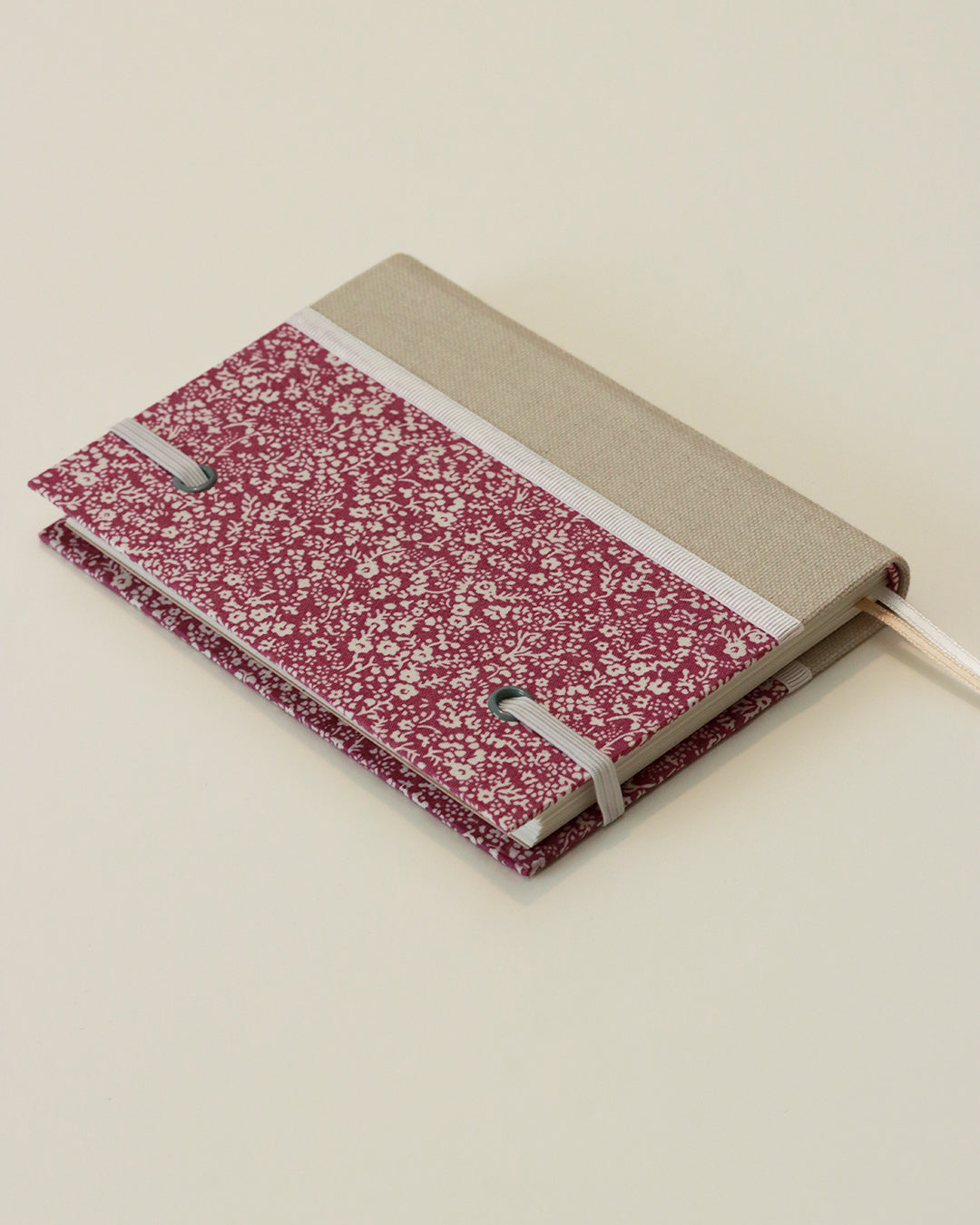 La rilegatura con dorso arrotondato ha uno stile moderno e lineare, quasi editoriale - evoca le prestigiose legature dei libri stampati, con un'estetica sobria e compatta. La sua bellezza non è appariscente, ma si rivela nei dettagli fini. La doppia linea ad arco del dorso e del capitello, il tessuto in tinta unita al centro, i nastrini colorati in gros-grain che segnano con precisione la divisione tra piatto anteriore, dorso e piatto posteriore, creando una composizione simmetrica (fantasia – tinta unita – fantasia): sono tutti elementi che parlano a chi ama l’ordine, l’equilibrio delle forme e gli oggetti ben fatti, rifiniti e funzionali con dettagli solidi e rassicuranti.