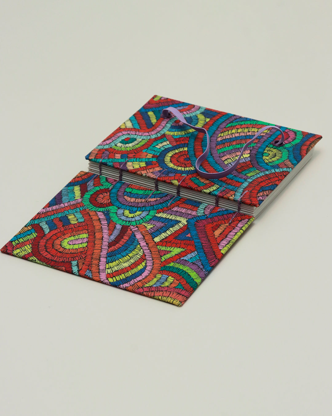 L'elastico di chiusura è lilla come gli occhielli e il filo di cucitura; i cartoncini che rivestono l'interno delle copertine sono marrone chiaro con eleganti scarti di fave di cacao visibili in superficie.