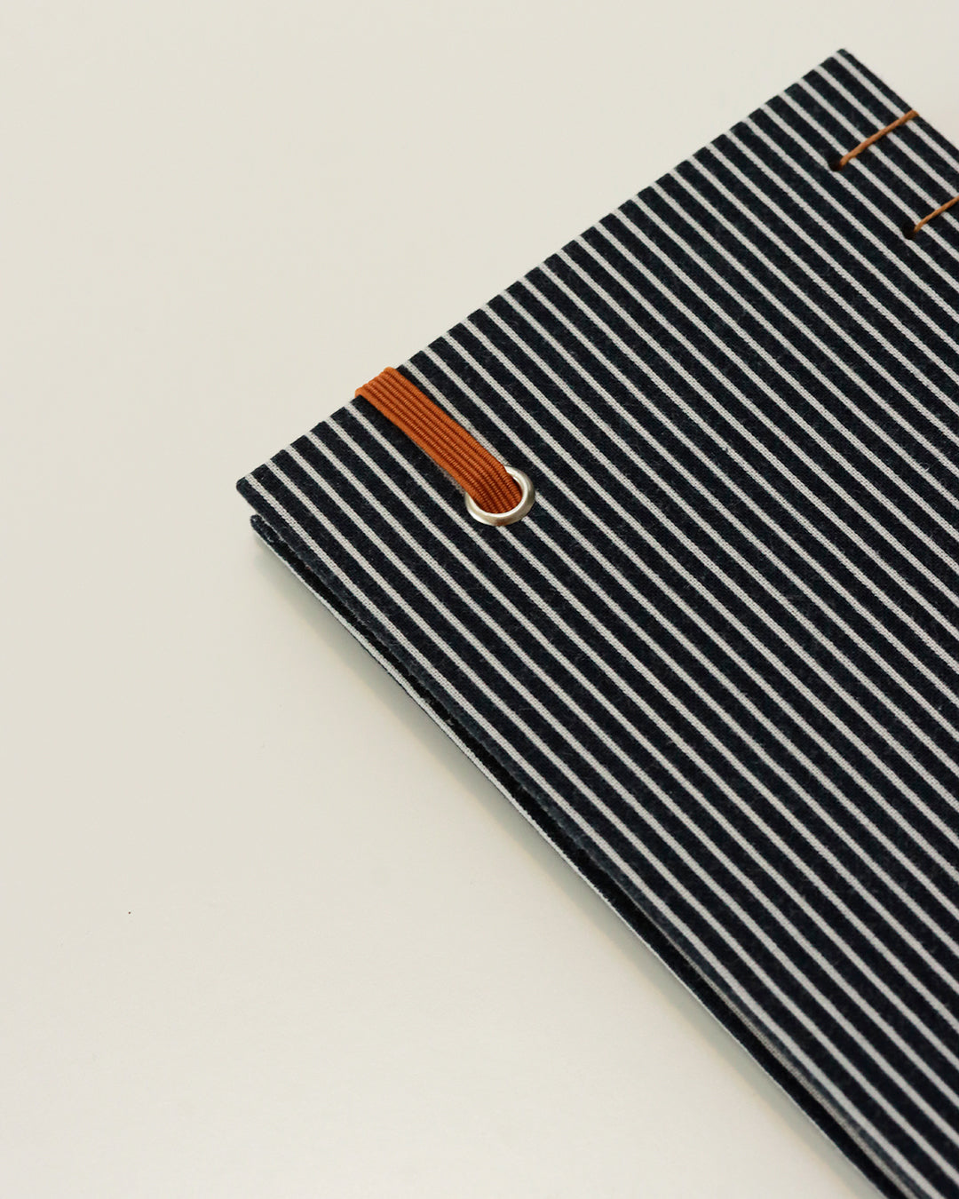 Tessuto di recupero da abitino in cotone rigato bianco e blu scuro ravvivato dai dettagli castano dorato (marrone): elastico e filo di cucitura. Gli occhielli sono bianchi.