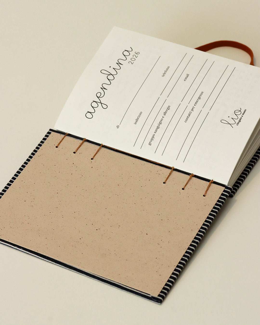 La rilegatura a mano consente l'accesso all'intera pagina e un'ottima apertura a (oltre) 180 gradi. Questo rende l'agenda molto comoda per scrivere sia appoggiate su un tavolo sia - perché no - sulle gambe: sì!, anche questo è un vantaggio della copertina rigida.