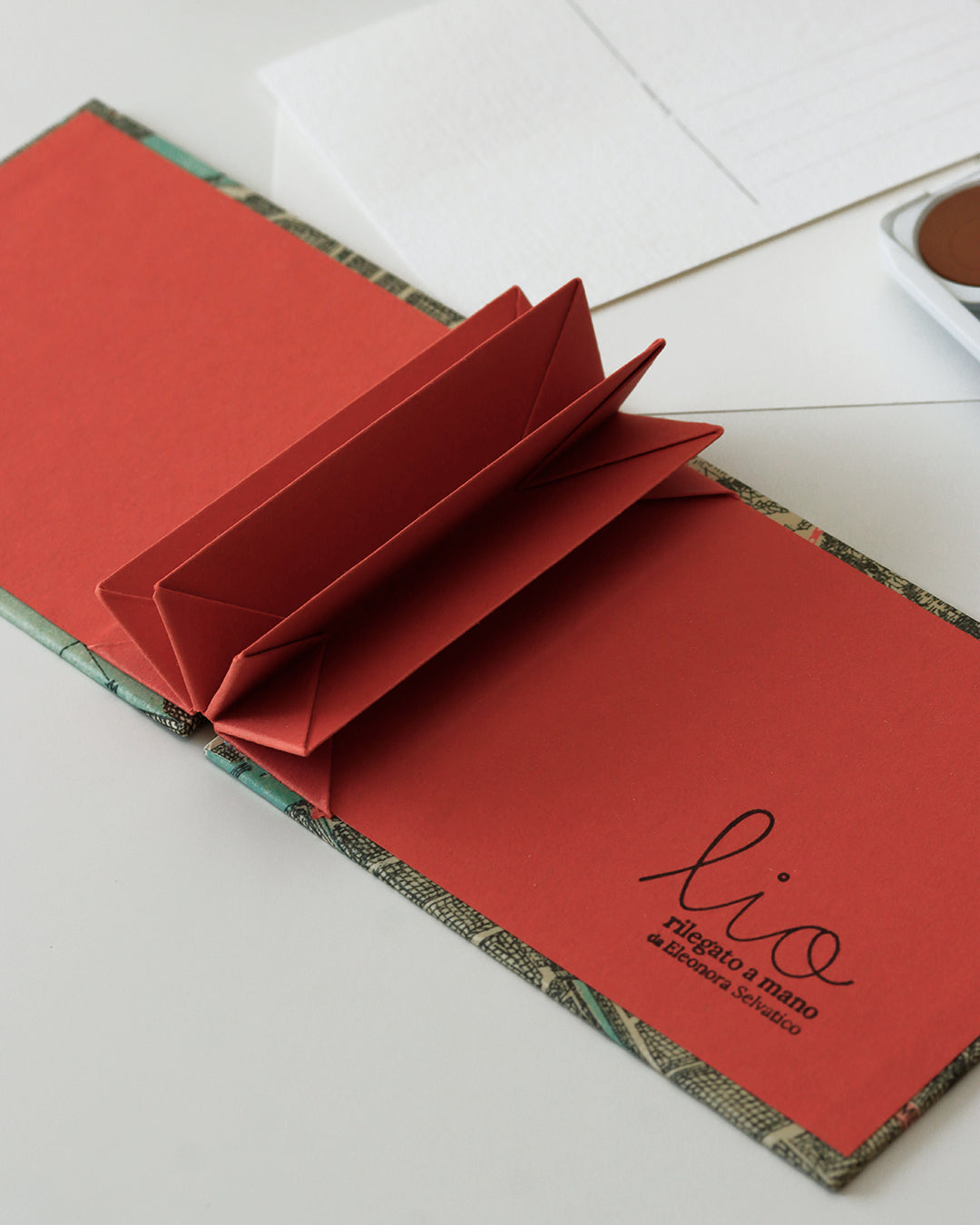 La rilegatura è realizzata con la tecnica di piegatura chiamata Blizzard di Hedy Kyle, caratterizzata da un dorso a fisarmonica che consente di infilare e sfilare le cartoline con un gesto semplice. Questo sistema permette anche di lavorare comodamente in piano, come su un normale foglio da disegno, e di sostituire le cartoline in futuro con altre nuove oppure con cartoline spedite e ricevute, trasformando l’album in un raccoglitore vivo e sempre in movimento.