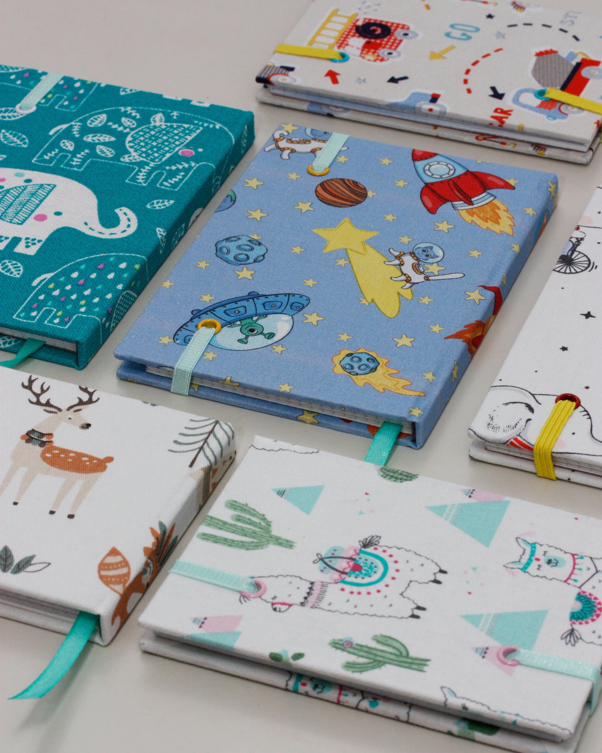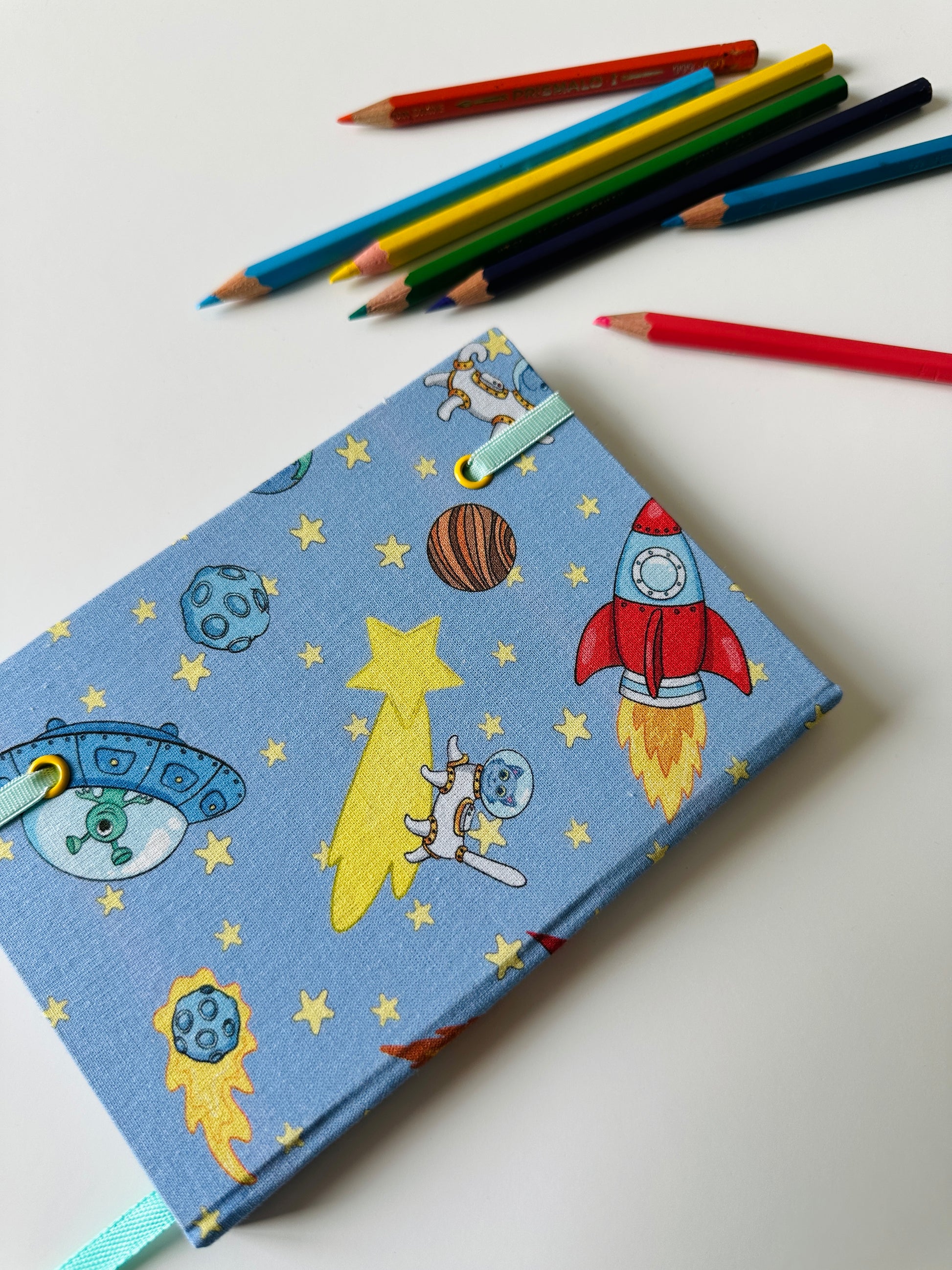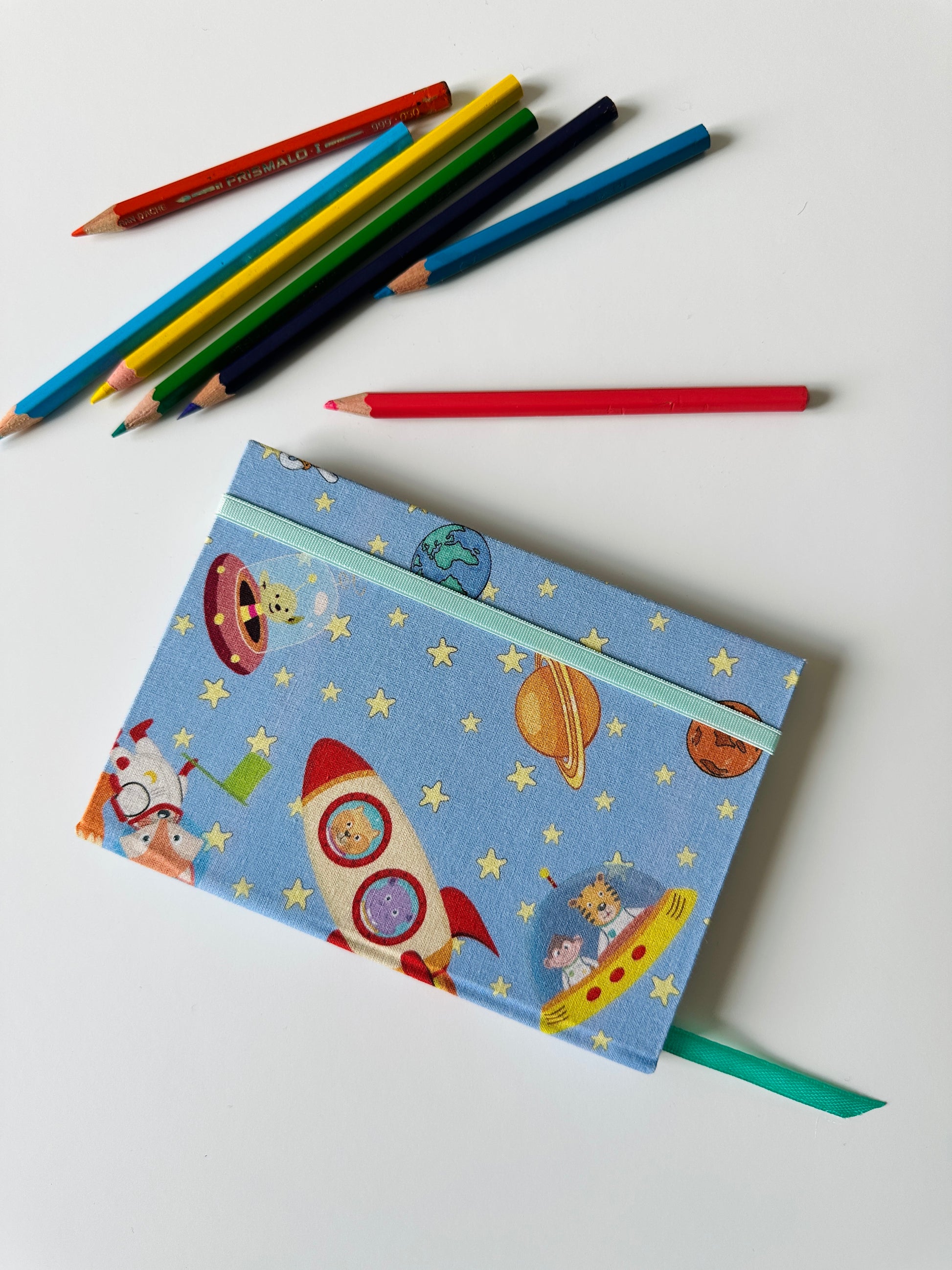 Le copertine rigide sono rivestite con un simpatico tessuto di cotone a tema spaziale: animaletti e alieni volano su delle astronavi in mezzo a un cielo azzurro con stelle e pianeti.