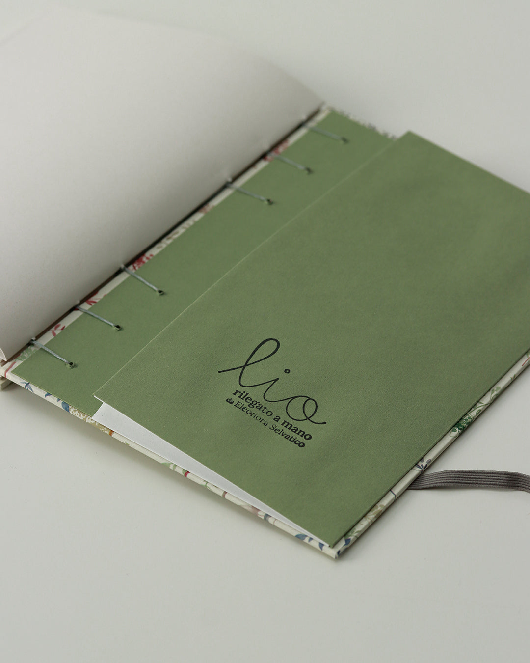 L’elastico di chiusura e gli occhielli grigi richiamano la neutralità del cartoncino materica verdigris con cui sono state create le pagine di guardia e la capiente coi bordi bianchi che rende questo quaderno di fine estate - inizio autunno un perfetto compagno di viaggio.