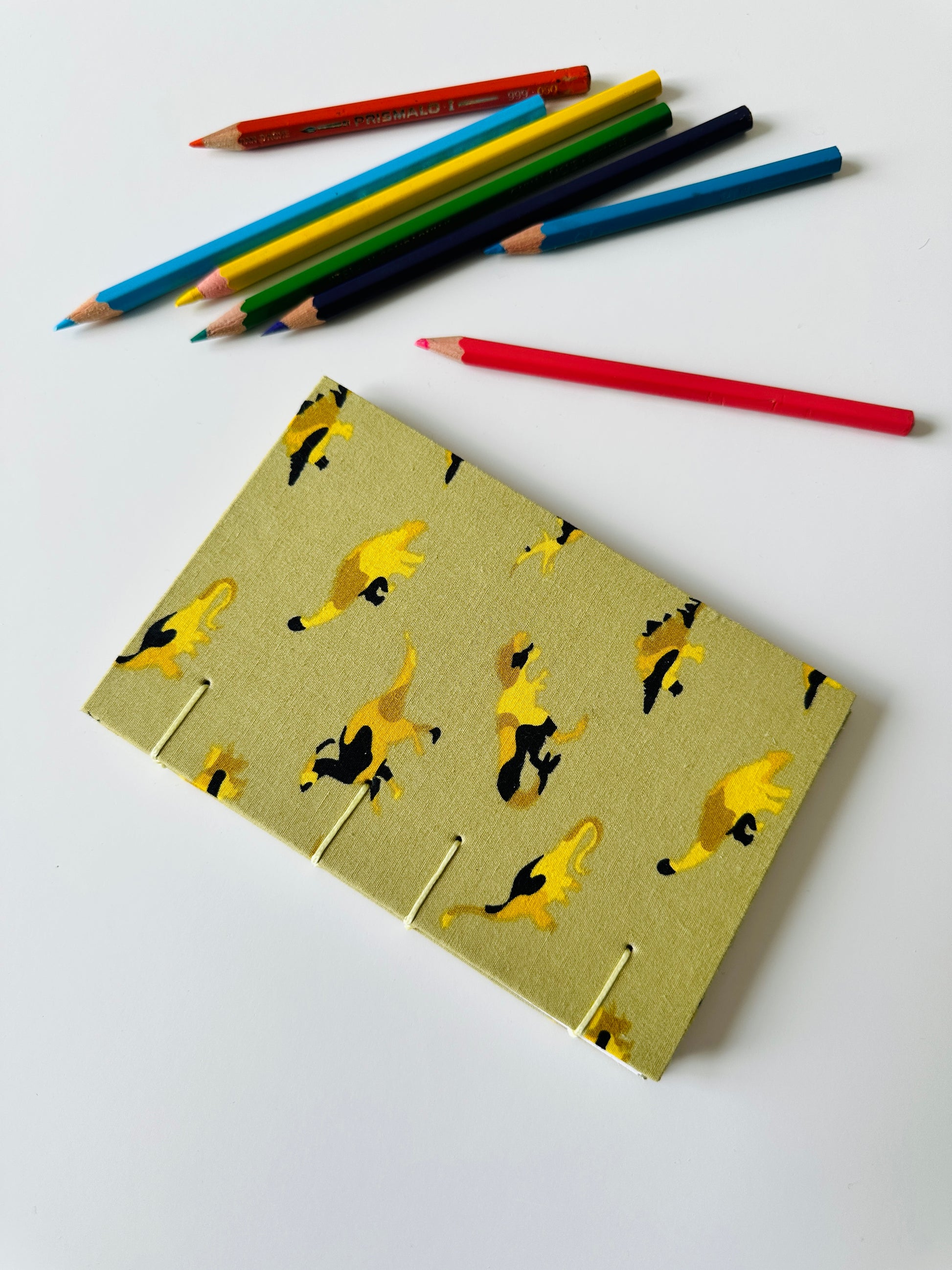 Le copertine rigide sono rivestite con un simpatico tessuto di cotone a tema dinosauri.