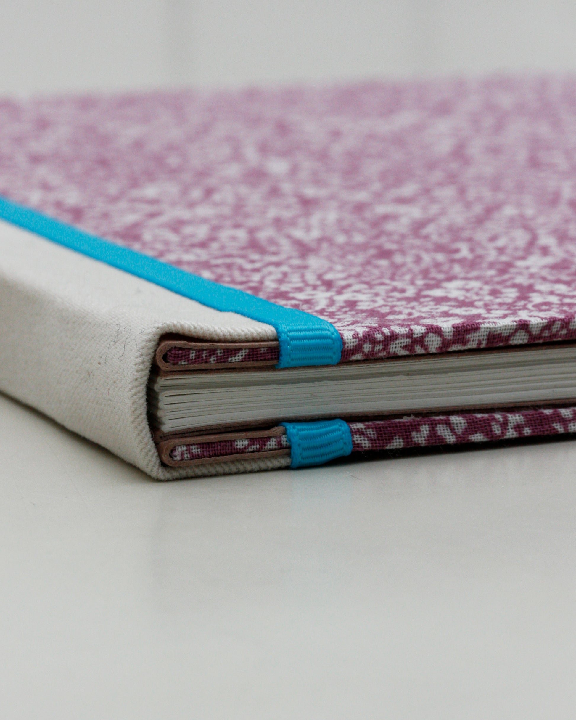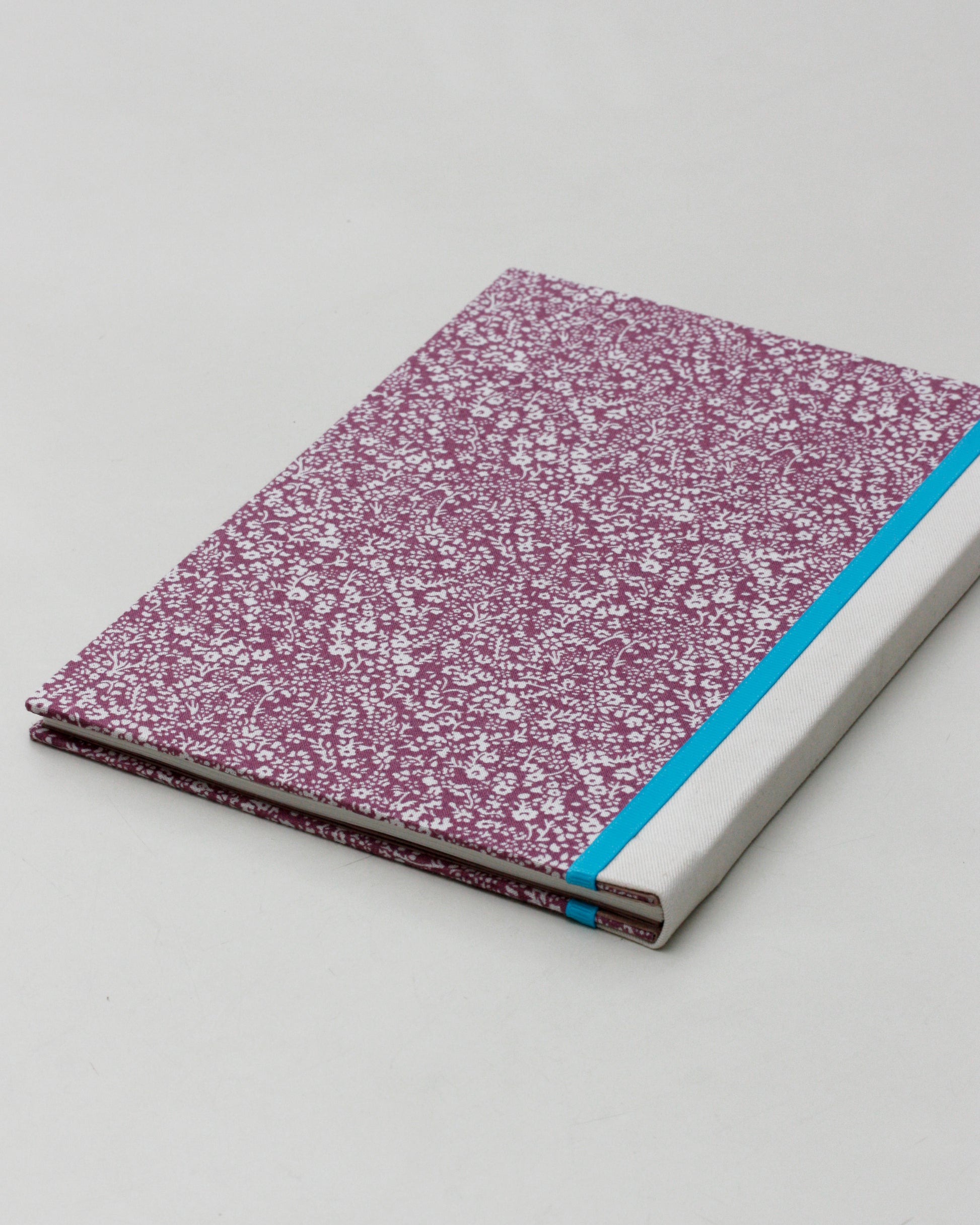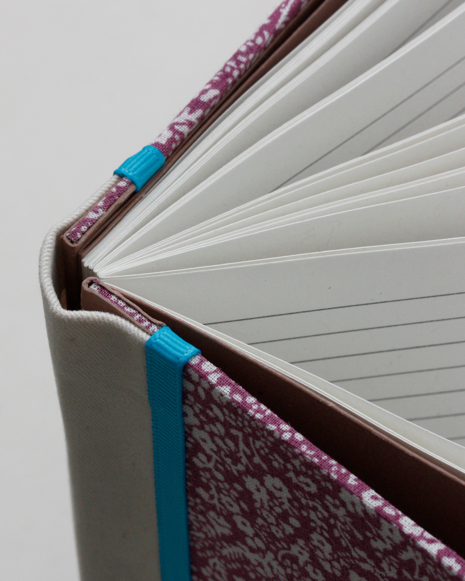 Tessuti in cotone di riuso: una camicia lilla con fiorellini bianco sporco ricopre le copertine cartonate, mentre il dorso è stato realizzato con dei pantaloni beige in disuso. I nastrini sono azzurri.