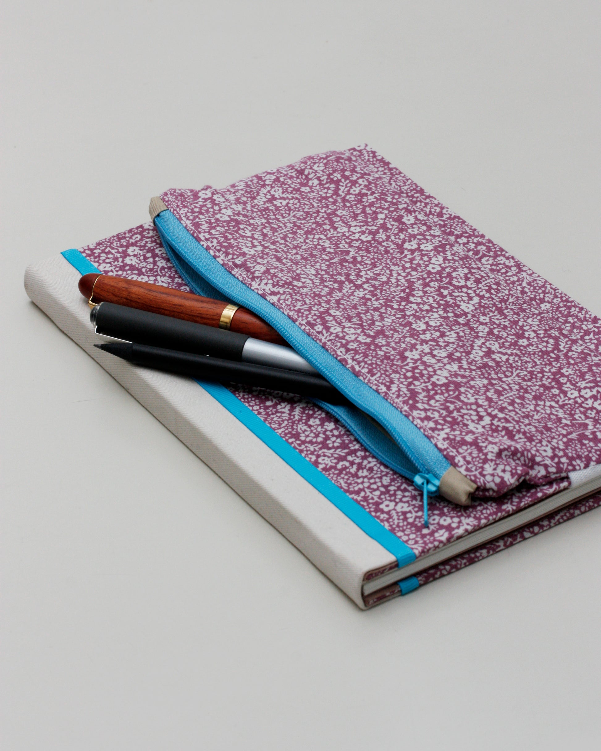 L'astuccio con elastico bianco è stato realizzato con lo stesso tessuto floreale, la cerniera è azzurra e l'interno è beige.