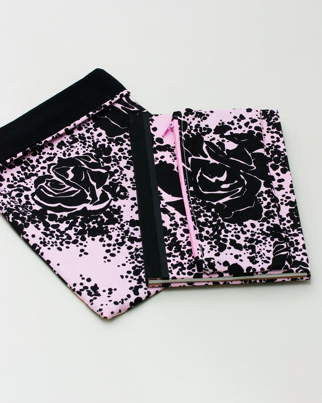 La custodia e l'astuccio con elastico nero e cerniera rosa sono stati realizzati con gli stessi tessuti del quaderno.