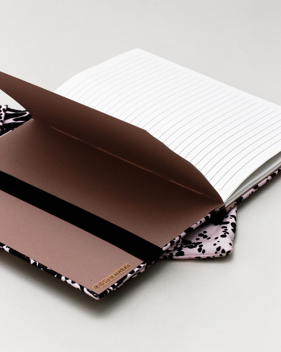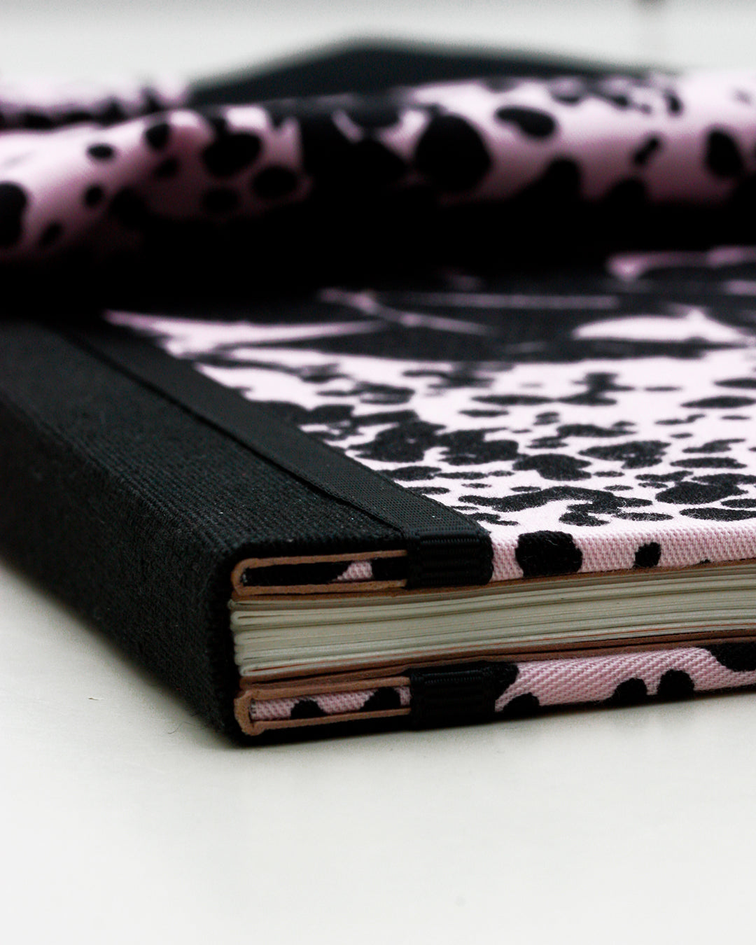 Tessuto in cotone di riuso: una gonna rosa con rose e pois schizzati neri che ricopre le copertine cartonate, mentre il dorso è stato foderato con dei pantaloni neri in disuso. I nastrini sono neri.