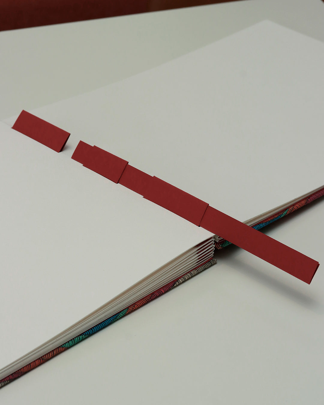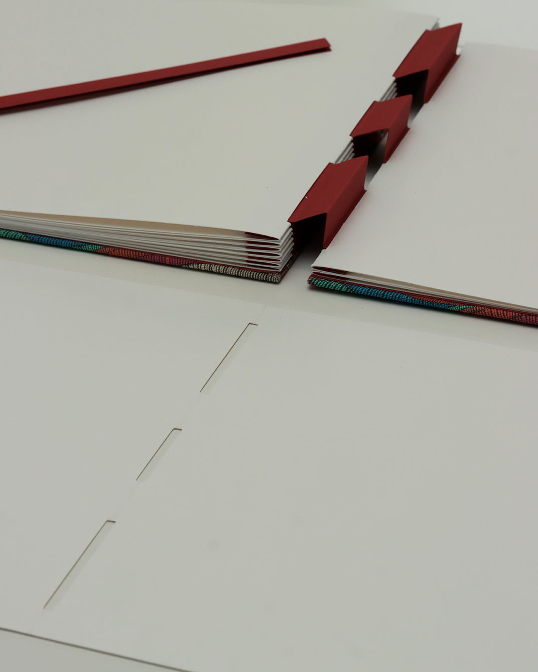 Togliere i fogli dal quaderno è molto semplice: innanzitutto si tira la listella (un cartoncino piegato in due col suo piccolo dorsino rivolto verso il basso) in modo che liberi l’incastro del foglio da acquarello montato su una piega; in seguito, si solleva verso l’alto il foglio da acquarello – afferrando la doppia pagina ai bordi – in modo da sfilarlo dal “monte” del dorso… a fisarmonica.