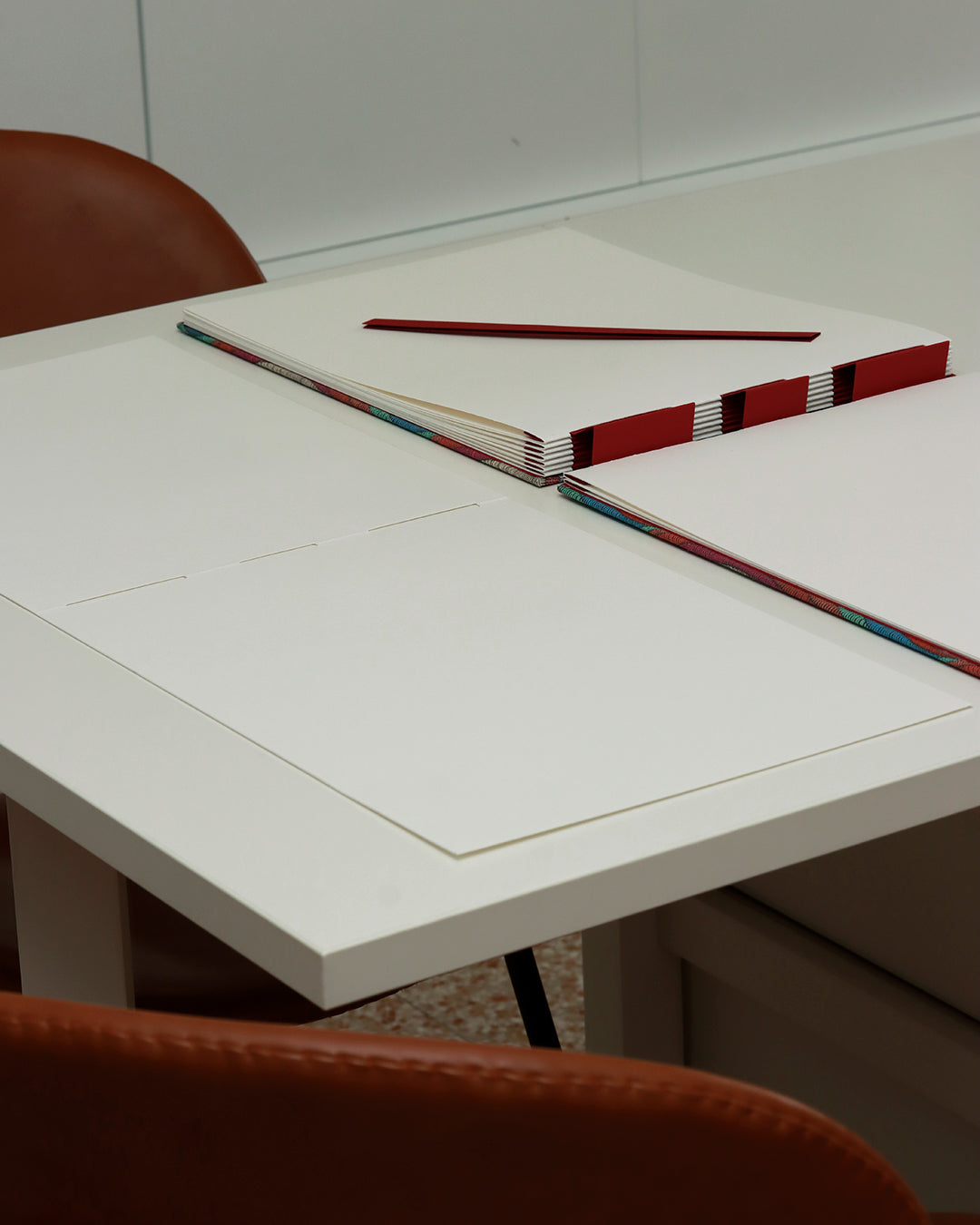 Le fisarmoniche, le listelle e i cartoncini che foderano l'interno delle copertine in cartone grigio rigido (100% riciclato) sono in in cartoncino ecosostenibile rosso "Crush" della cartiera Favini che contiene il 15% di scarti di ciliegia dell'industria alimentare italiana.