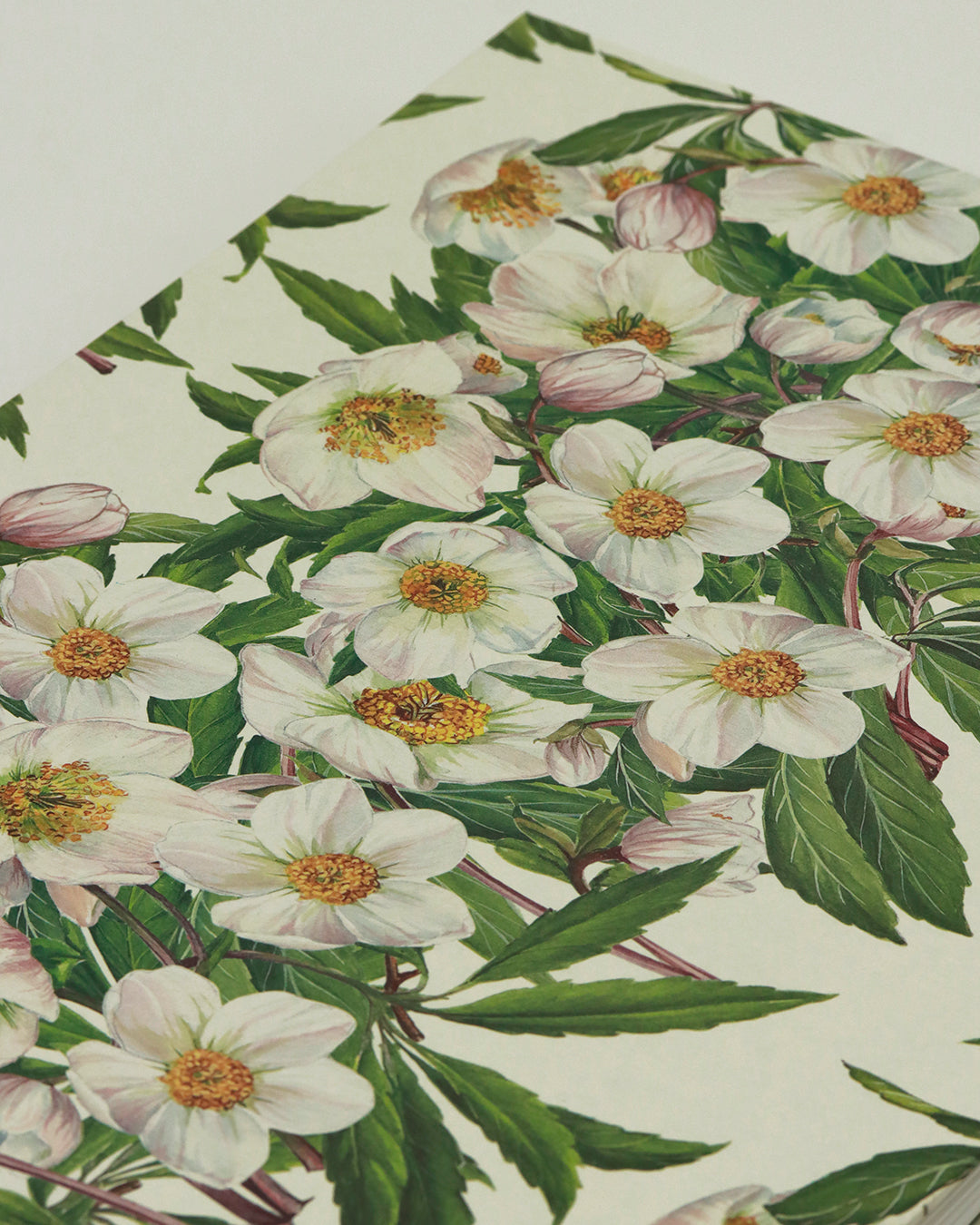 Morbida carta decorativa bianca di Grafiche Tassotti con illustrazione botanica di elleboro.
