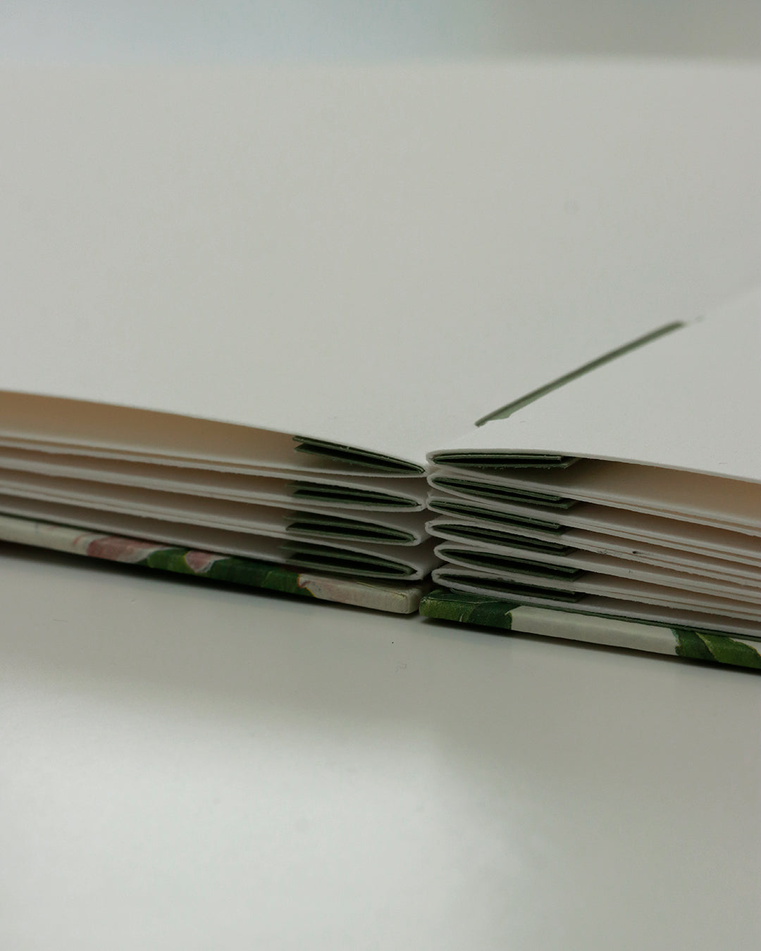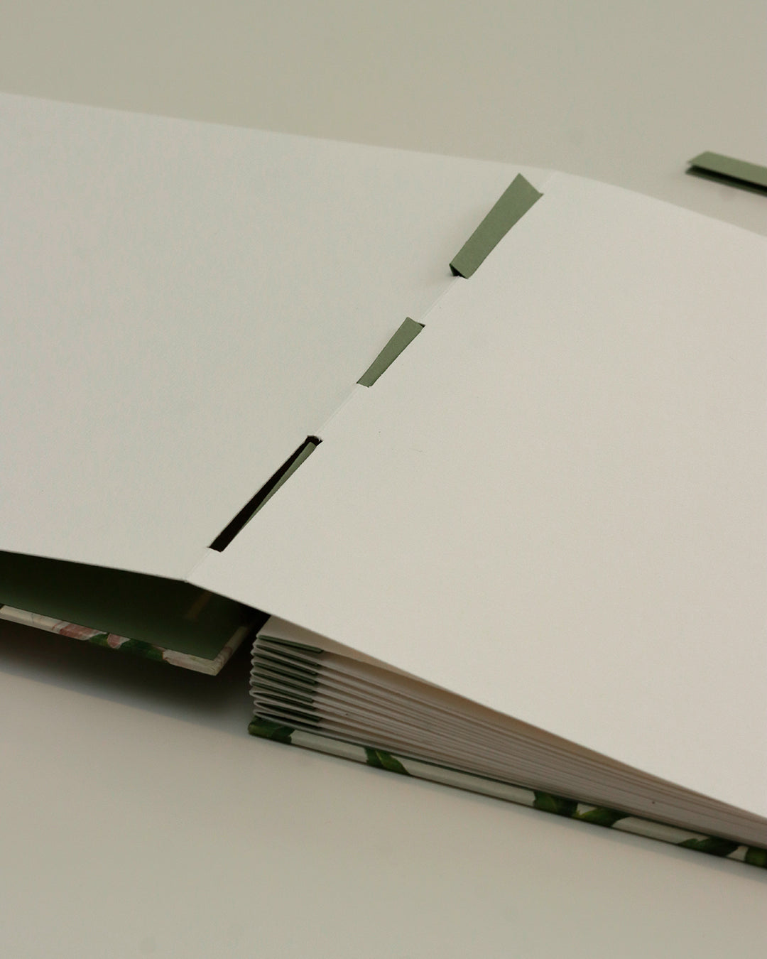 Ebbene sì: il dorso di questo quaderno è una fisarmonica e per questo motivo è anche possibile inserire degli spessori (come fotografie, cartoline, ritagli di carta ma anche di altri materiali come stoffe e piccoli tesori della natura) al suo interno senza alterare la sua funzione protettiva. Gli spessori saranno accolti in altezza dal dorso a fisarmonica che crescerà solo lì dove sarà necessario. È così possibile adoperare questo quaderno anche per realizzare dei collage o progetti che combinano tecniche artistiche diverse.