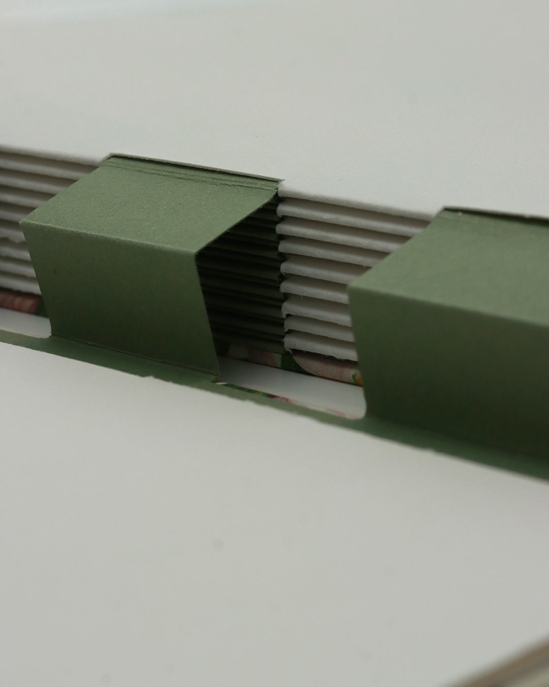 Le fisarmoniche, le listelle e i cartoncini che foderano l'interno delle copertine in cartone grigio rigido (100% riciclato) sono in cartoncino naturale (senza cloro e metalli pesanti e con pH neutro) appartenente alla collezione Materica della storica cartiera italiana Fedrigoni.