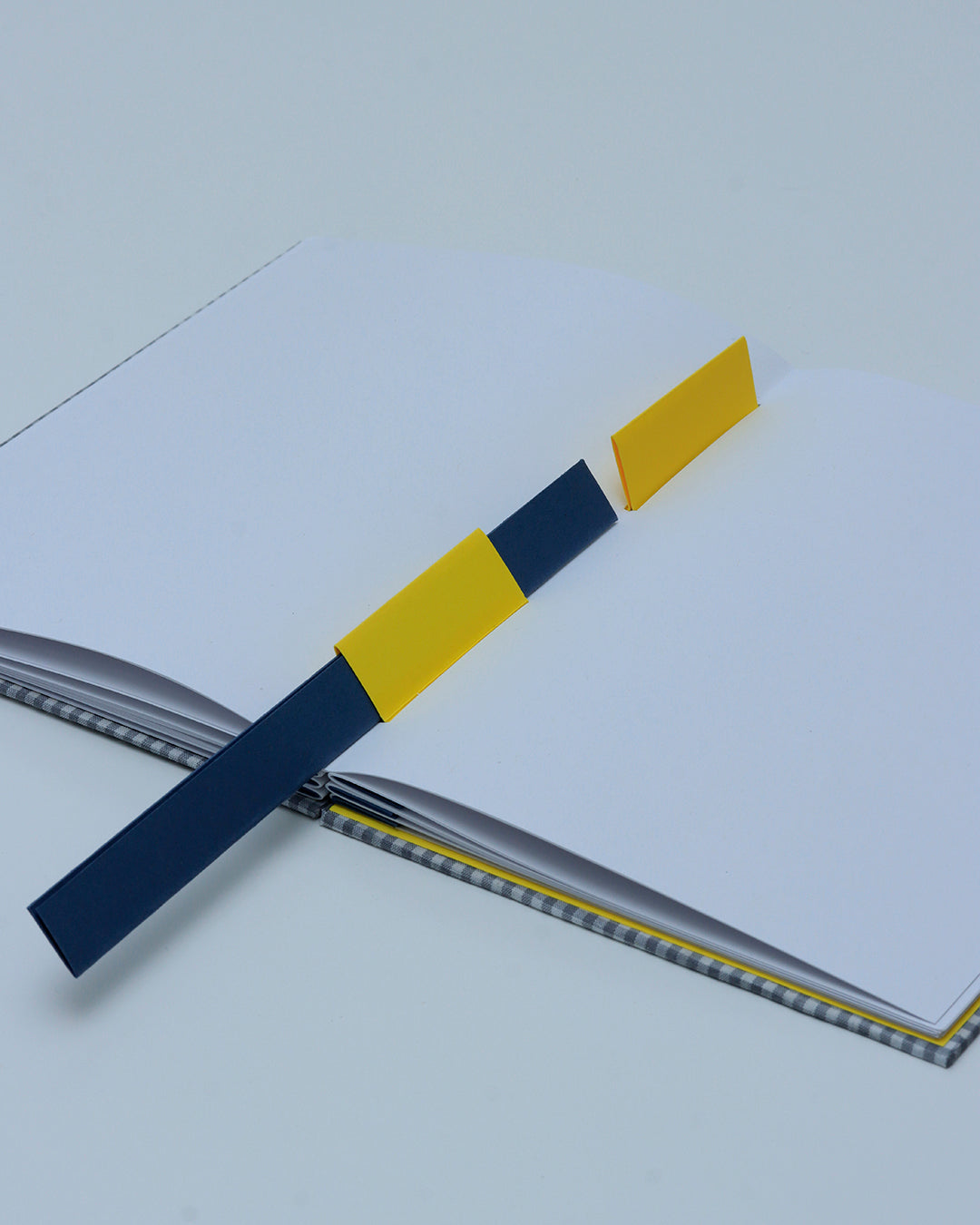 Le listelle blu, che permettono l'incastro delle pagine nel dorso a fisarmonica, sono in cartoncino ecologico Crush di Favini contenenti scarti di lavanda.