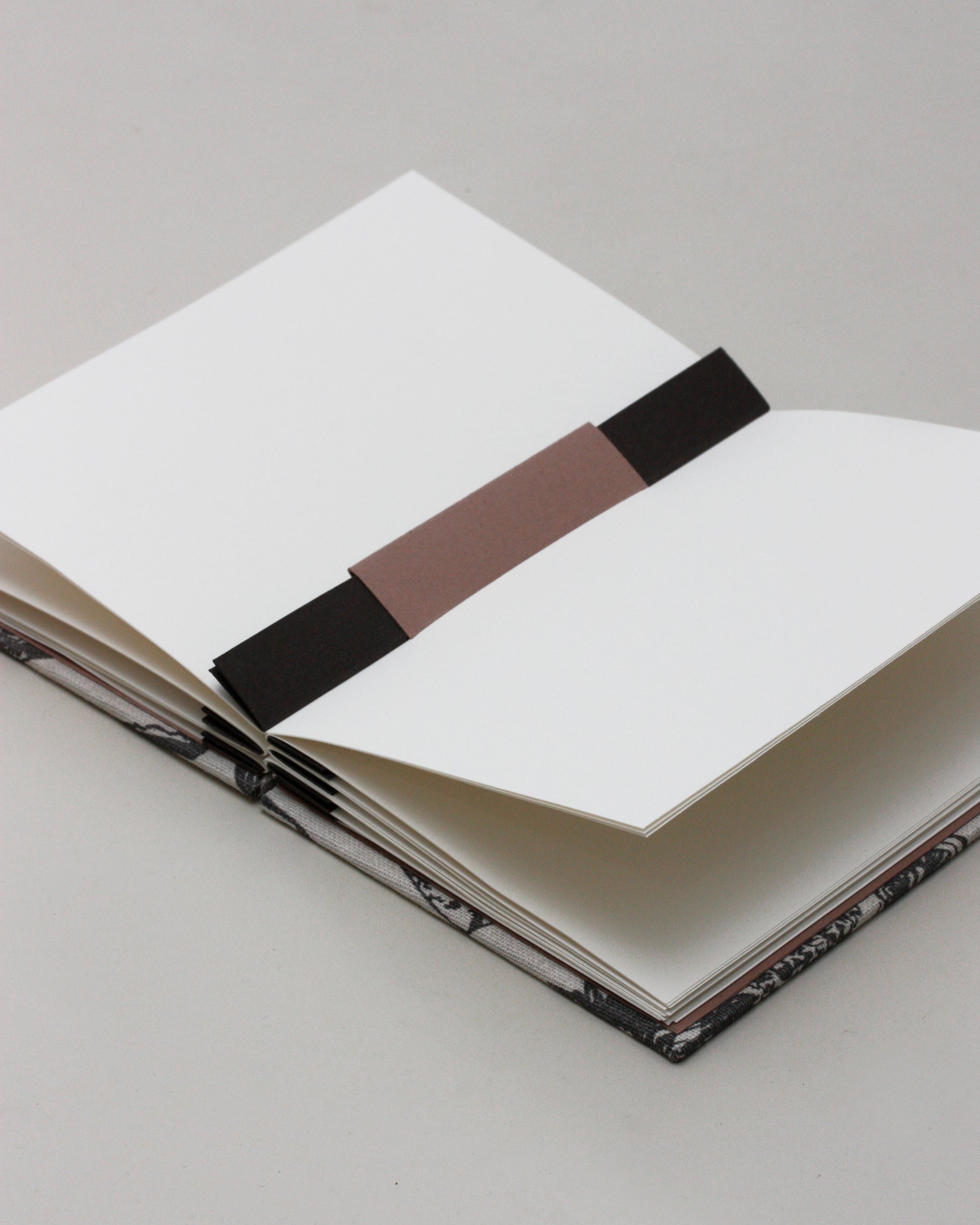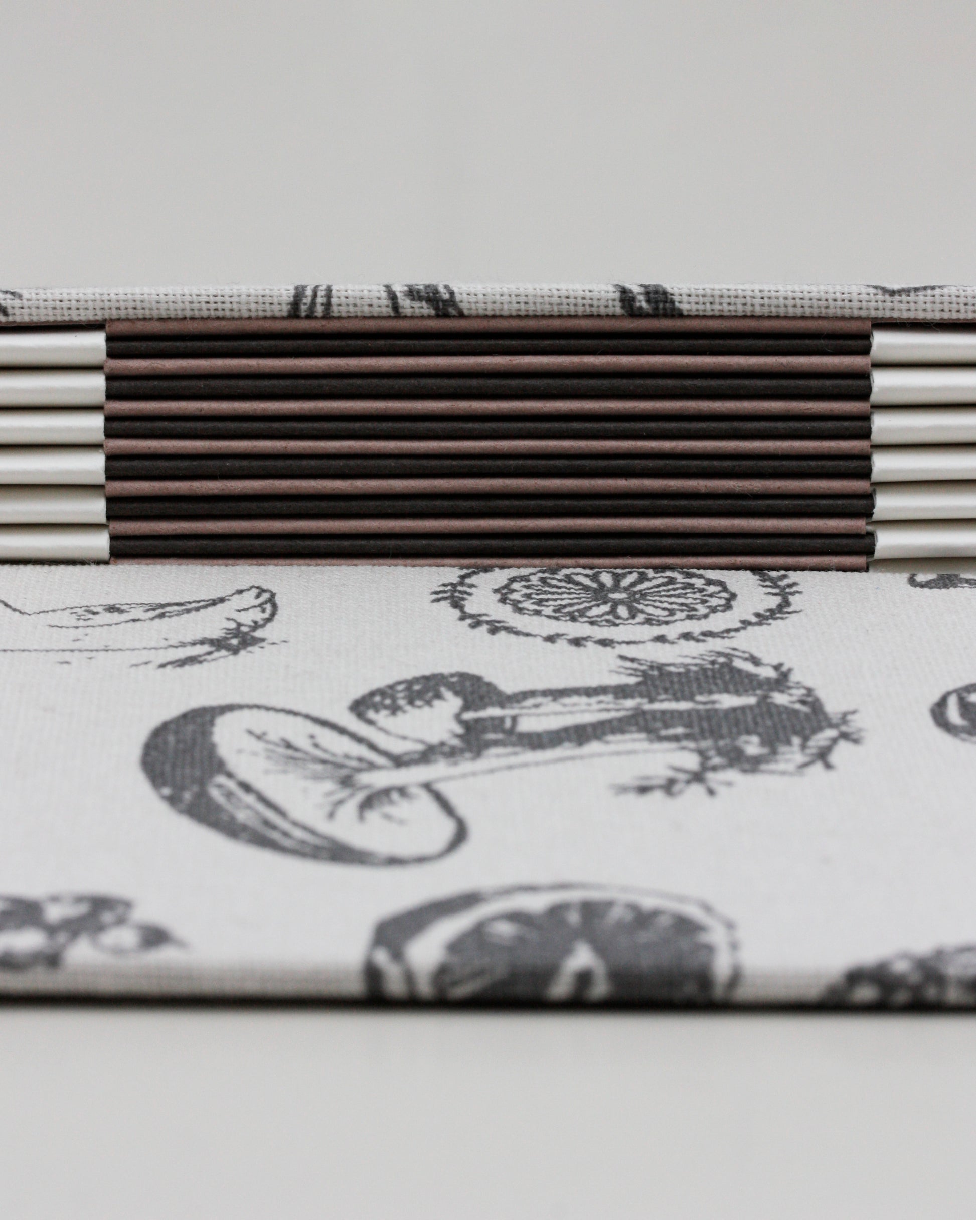 Le listelle marroni e la singola fisarmonica rosa neutro, che permettono l'incastro delle pagine nel dorso a fisarmonica, sono in cartoncino ecologico Crush di Favini contenenti scarti di caffè (marrone) e mandorla (rosa).