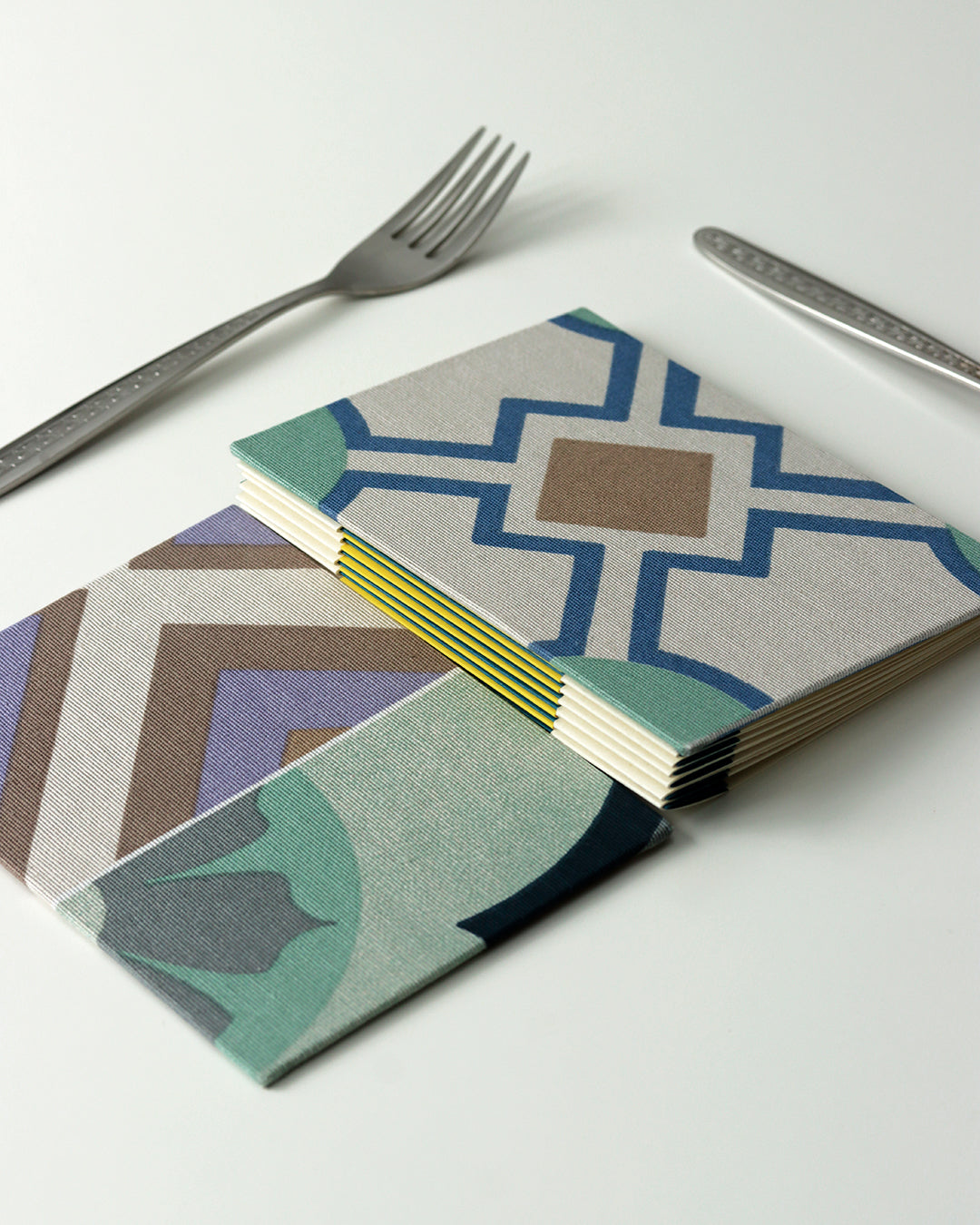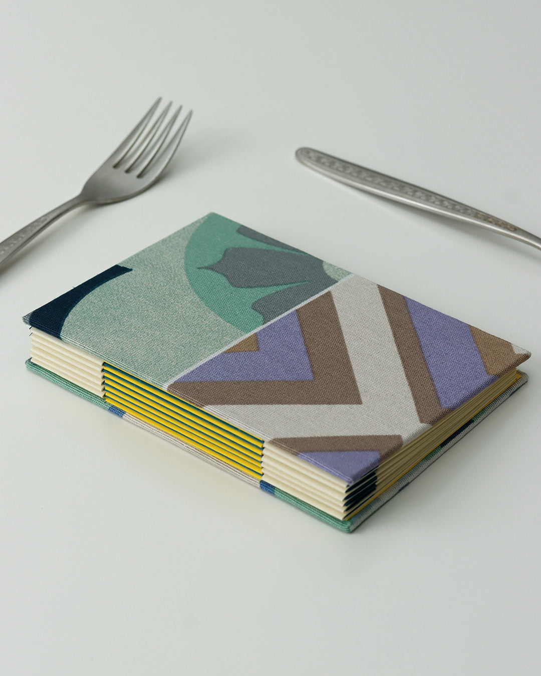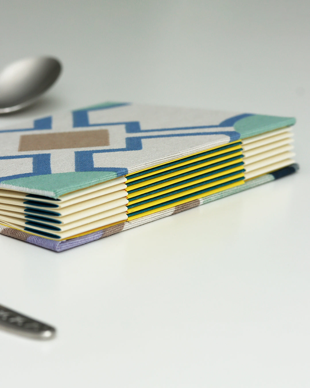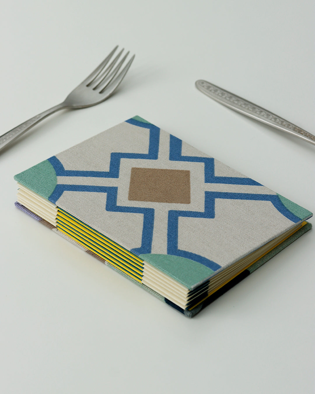 Ricettario formato A6, carta agrumi, rilegatura australiana, piastrelle colorate verde acqua blu, bianco, beige, grigio, lilla