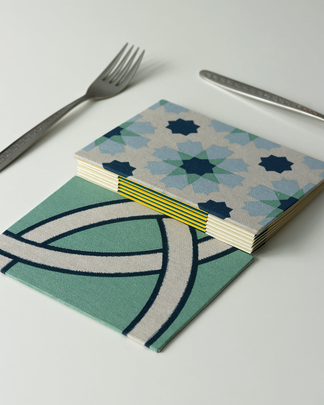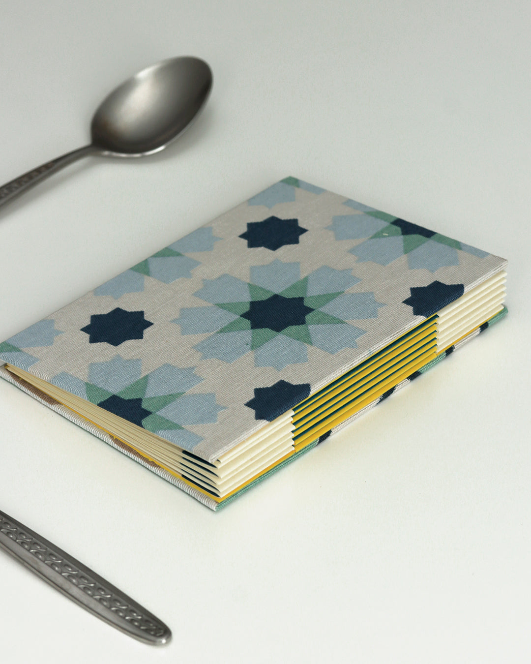 Ricettario formato A6, carta agrumi, rilegatura australiana, piastrelle colorate verde acqua, blu, bianco e azzurro